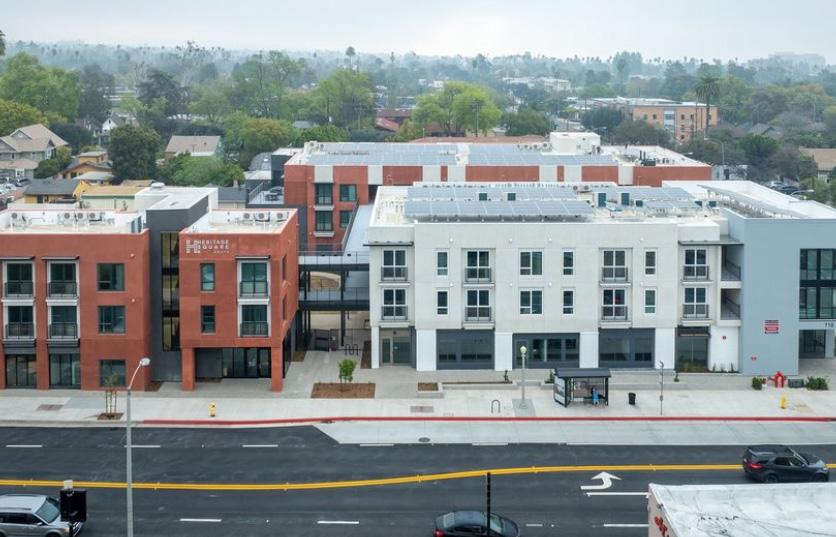 Amenities at Heritage Square South include a leasing office, an onsite manager, 24-hour security, laundry rooms, an outdoor courtyard, outdoor lounging areas, two flex rooms, and a community room. It also includes 2,200 square feet of commercial space. Powered in part by renewable energy, Heritage Square South is an Affordable Multifamily GreenPoint Rated Platinum project, according to the developer.