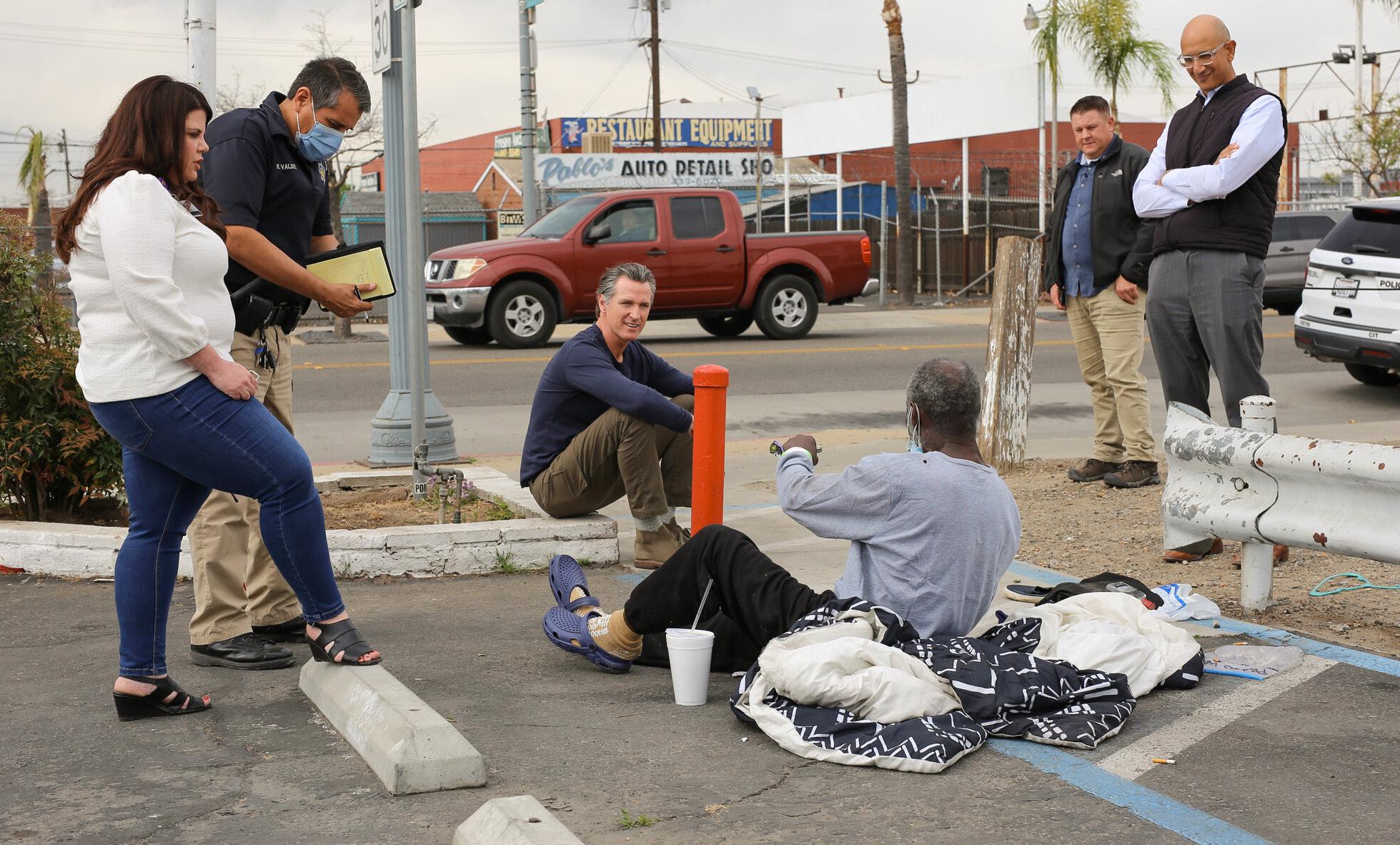 Gov. Gavin Newsom chats with a man experiencing homelessness, both seated, as officials observe in Fresno in 2022. | Photo courtesy of California Governor/Flickr (CC BY-NC-ND 2.0)