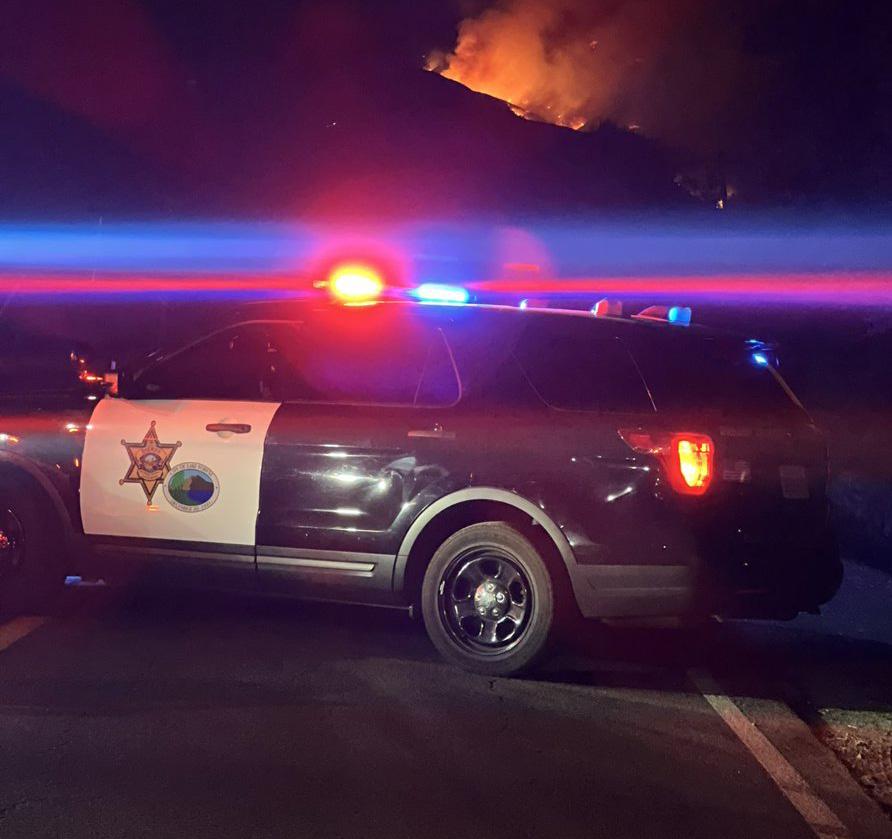 An OC Sheriff's Department vehicle blocks Santiago Canyon and Live Oak Canyon roads as the Airport Fire burns hillsides in the distance. | Photo courtesy of OCFA PIO/X