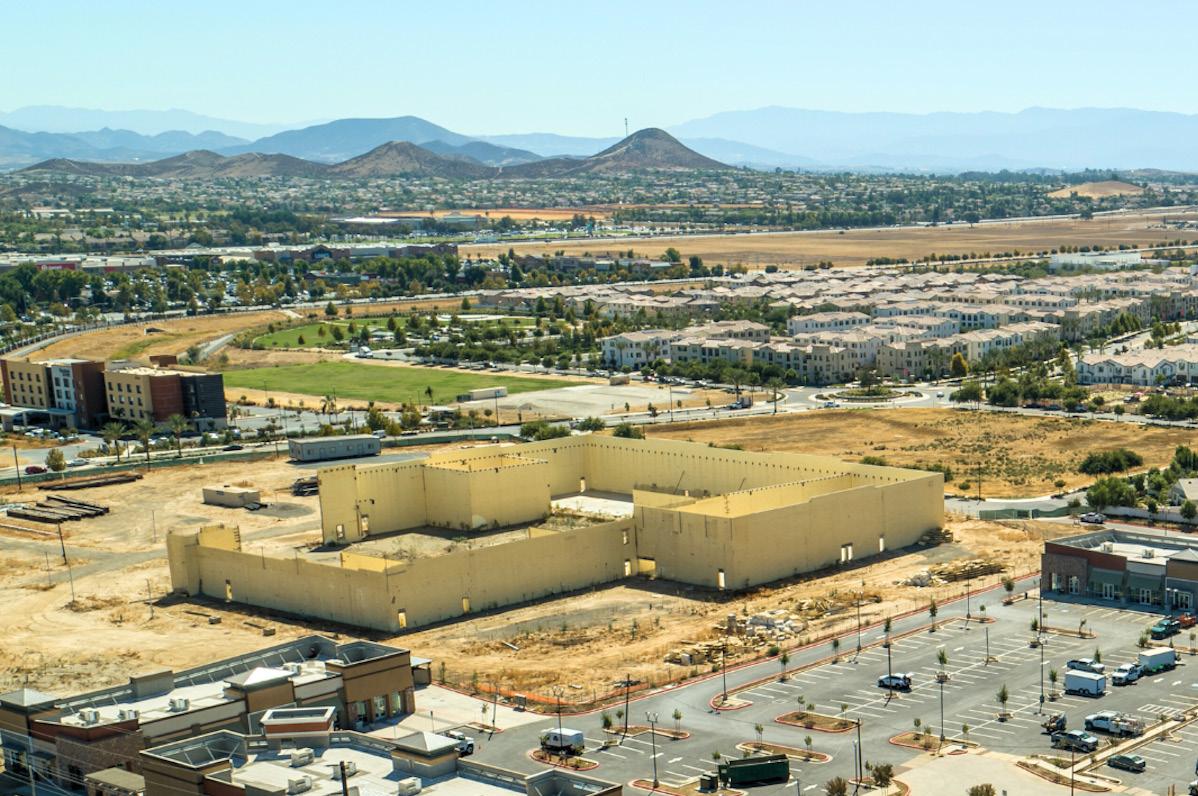 of Newport Road and Town Center Drive, across from the Menifee Town Center plaza. However, developer Showprop Menifee LLC suspended construction for unclear reasons, leaving only the skeletal structure in place in the first half of 2023.