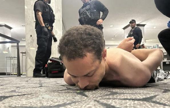 Cole Tomas Allen lays on the floor of a ballroom in the Washington Hilton in the custody of federal agents Sunday after he allegedly tried to assassinate President Donald Trump and administration o cials at the White House Correspondents' Dinner. | Photo courtesy of President Donald Trump/Truth Social