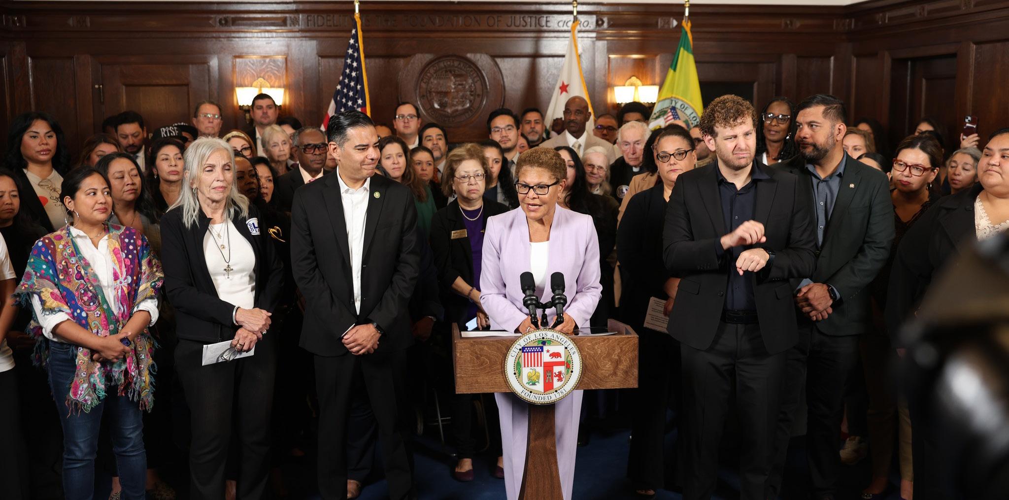 City Council members Eunisses Hernandez, Ysabel Jurado and Hugo SotoMartinez joined Bass and Garcia for the news conference alongside a group of city workers and immigrant rights advocates.