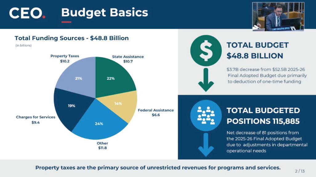 Amidareduction infederalspending, ongoing legal settlements and liabilities, Los Angeles County officials Monday unveiled a proposed $48.8 billion budget for fiscal year 2026-27, which represents a 7% decrease compared to the current spending plan.