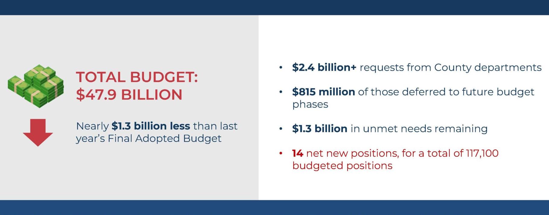 Therecommended budget reflects efforts to "offset extraordinary budget pressures," according to a statement from the county, including more than $1 billion in costs related to the January wildfires. The county will also begin to feel the pain of a proposed $4 billion settlement of nearly