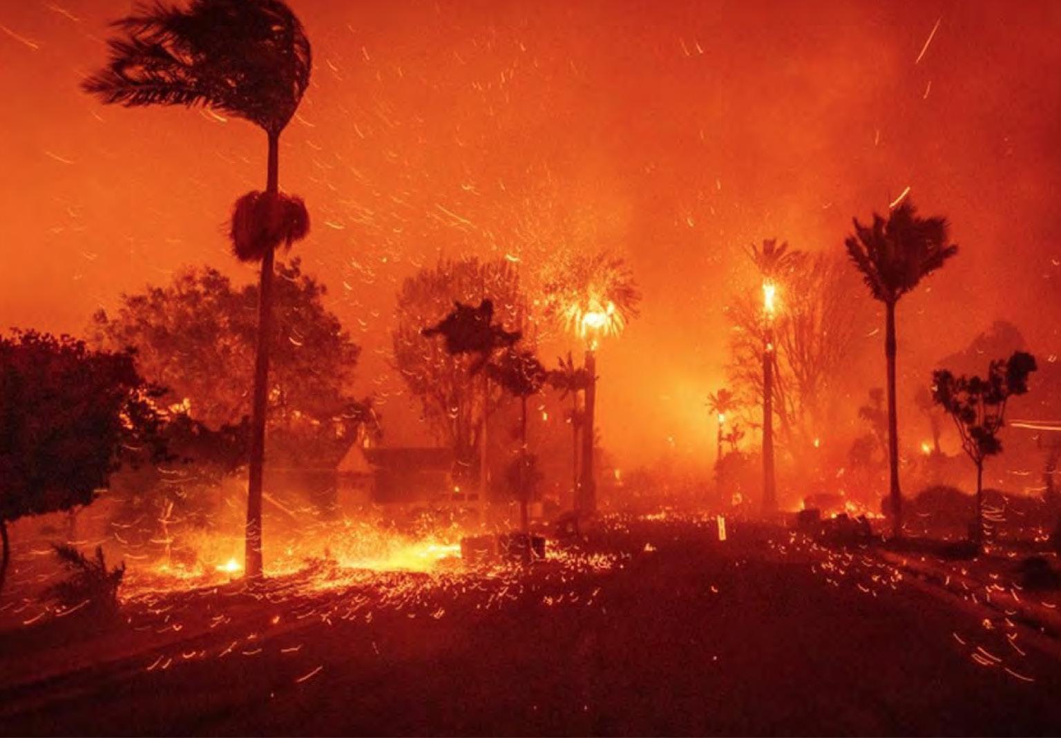 A county fire engine stations near burning structures during the January wildfires. | Photo courtesy of Los Angeles County