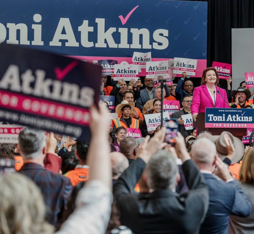 Atkins, a former San Diego City Council woman, acting mayor,assemblywoman, Speaker of the Assembly and President pro tempore of the California State Senate, announced her gubernatorial candidacy in January 2024.