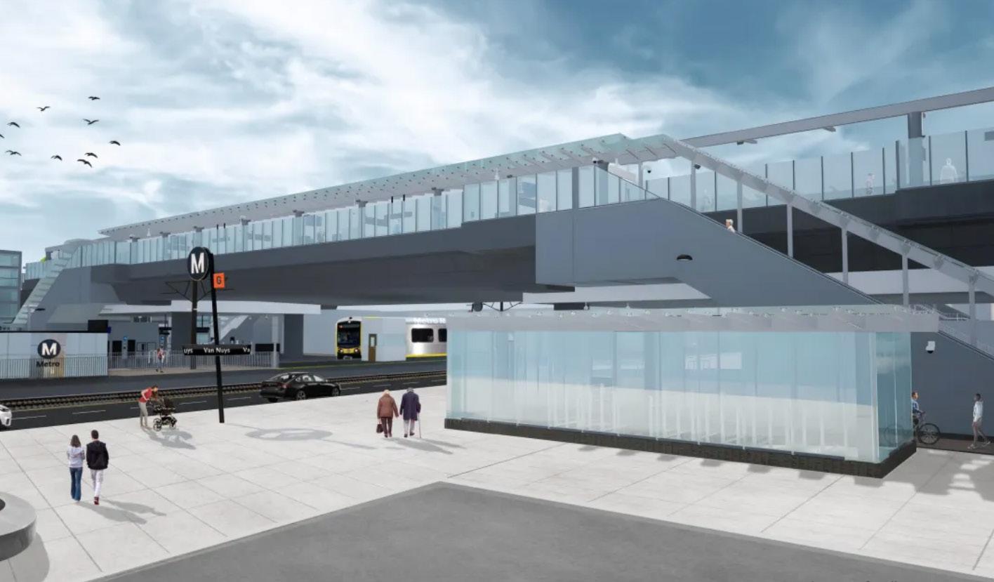 A conceptual rendering of the new aerial Van Nuys Station for the G Line. The rail line seen beneath the bridge is the future East San Fernando Valley Light Rail Project; the first section will run between Van Nuys and Pacoima. Metro is in the pre-construction phase on that project. | Rendering courtesy of Metro