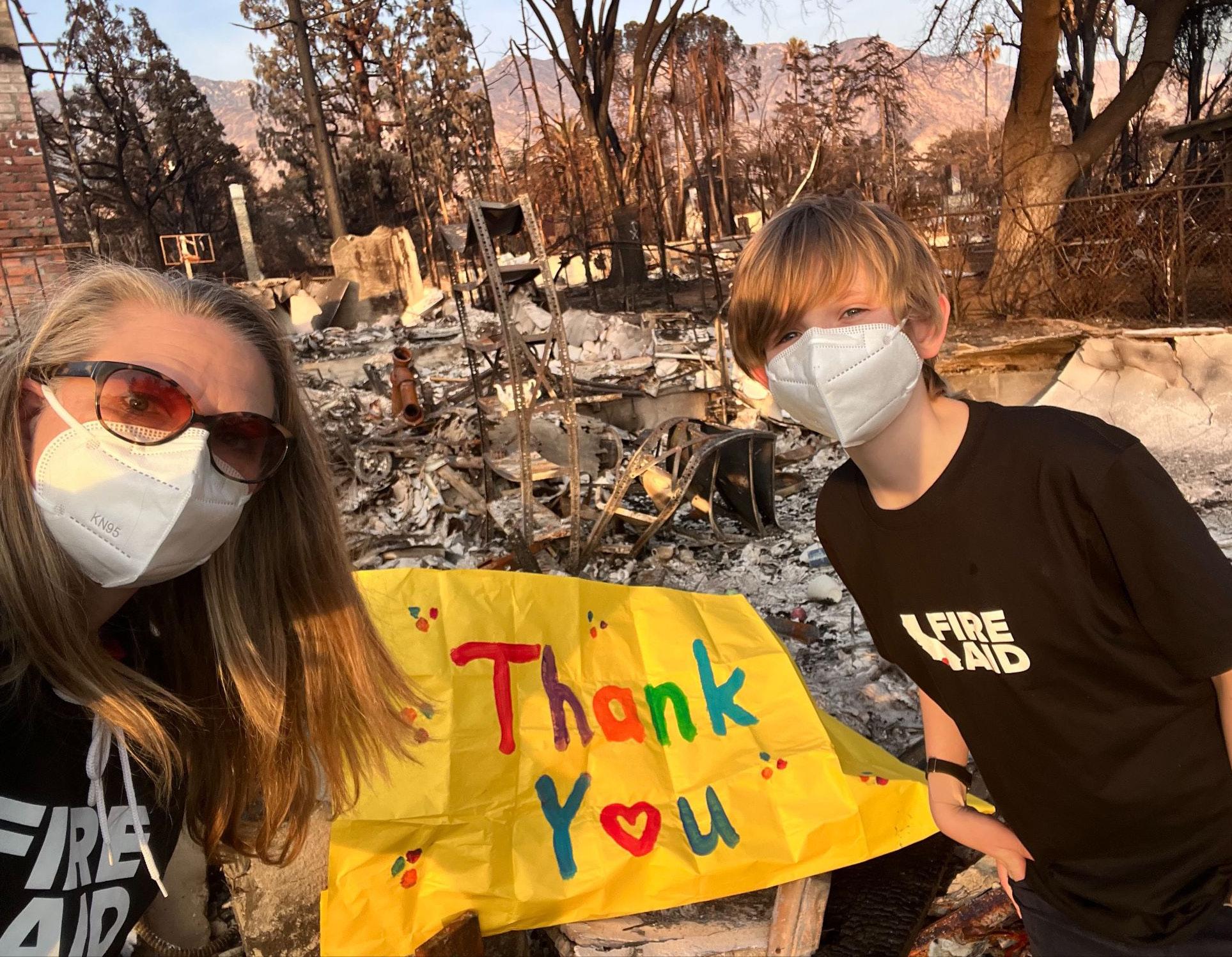 Kelsey Brown and her son Calder thank first responders in front of the remains of their Altadena home.