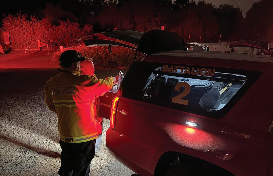 A firefighter and a local resident discuss evacuation procedures Saturday night in the Carbon Canyon area. | Photo courtesy of OCFA/X
