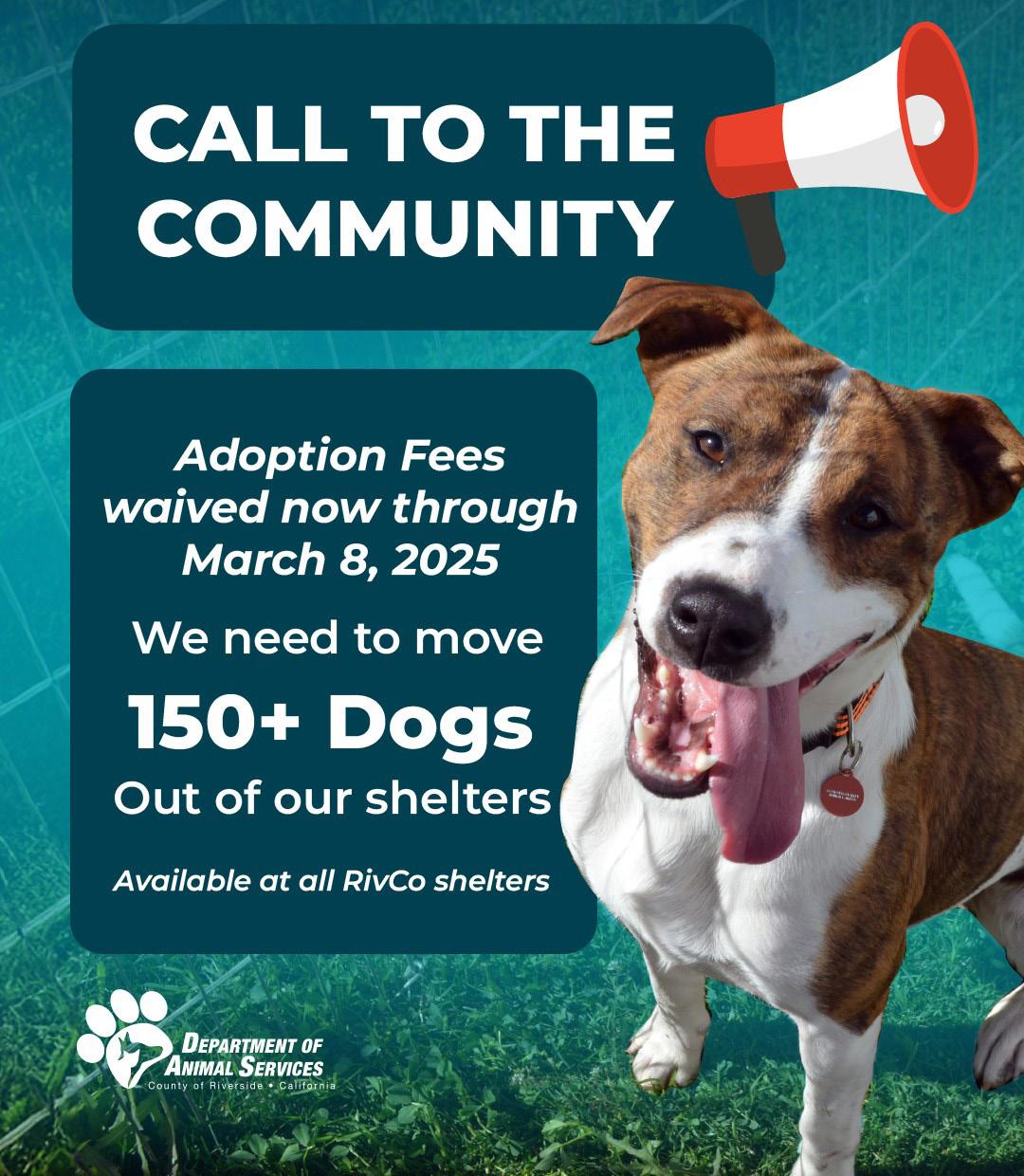All canines, including puppies, will be available to take home without adoption fees through Saturday in Riverside County as part of an effort to free up space at the county’s four shelters, which are operating over capacity.