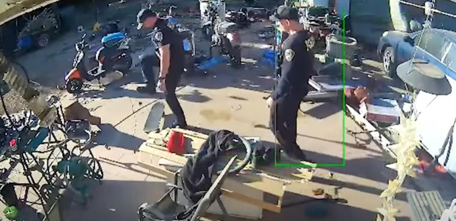 com, six officers can be seen in the patio area of a residence. It is unclear what the officers were doing at the residence or who they were looking for.