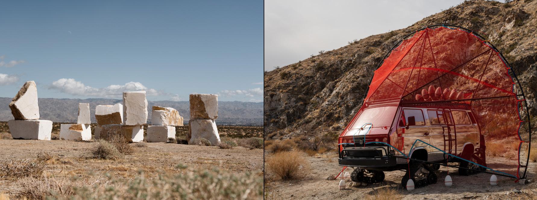 Desert X 2025 art exhibits by Jose Dávila, left, and Cannupa Hanksa Luger. | Photos courtesy of Desert X