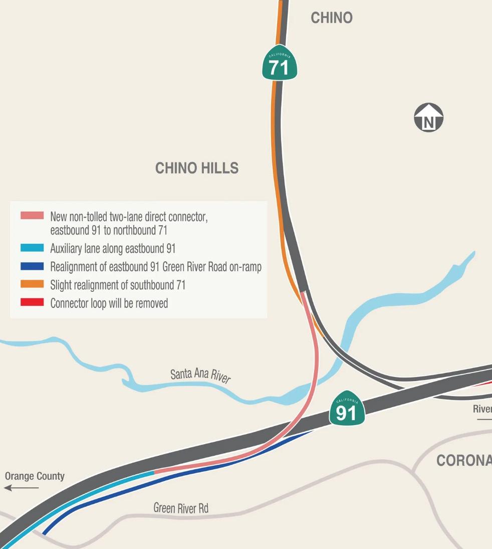 The 71/91 Interchange Project has been underway since February 2023. The $137 million enterprise entails replacing the current single-lane connector from the eastbound 91 to the 71 with a two-lane connector loop, which will accommodate a larger number of vehicles.