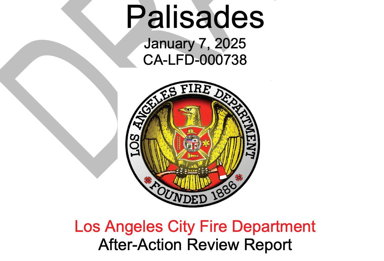 led by Bass in October 2025 also involved the release of the Palisades Fire afteraction report after federal prosecutors announced the part played in the wildfire by the smaller fire. The LAFD was facing criticism for not fully extinguishing the earlier blaze.