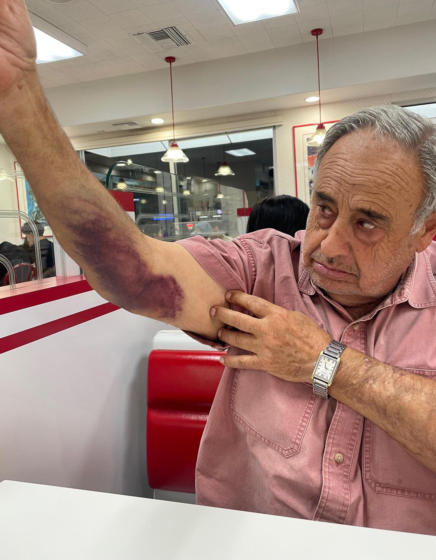 Rafie Ollah Shoued displays one of his injuries he suffered during an immigration enforcement raid at his San Fernando Valley business. | Photo courtesy of Robert Frank