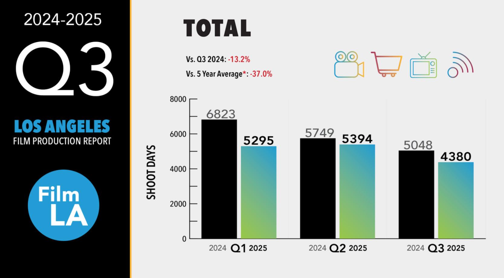 The L.A. region had 4,380 shoot days in the third quarter of the year, or 668 fewer shoot days, compared to 5,048 shoot days in the summer of 2024, according to figures released by FilmLA -- the partner film office for Los Angeles County and city, and other local jurisdictions.