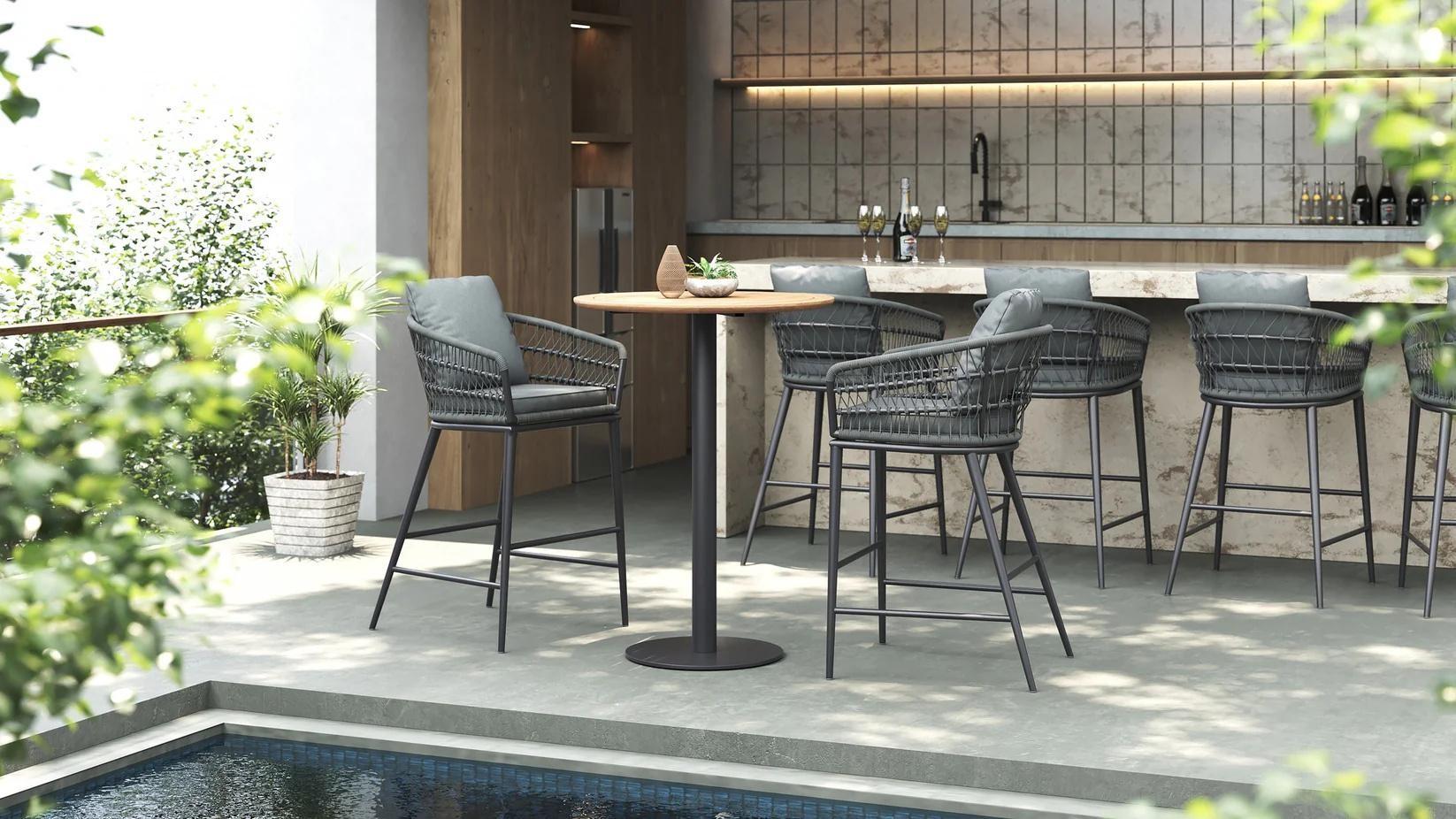 • Embrace bold materials like teak, acacia, or powdercoated steel