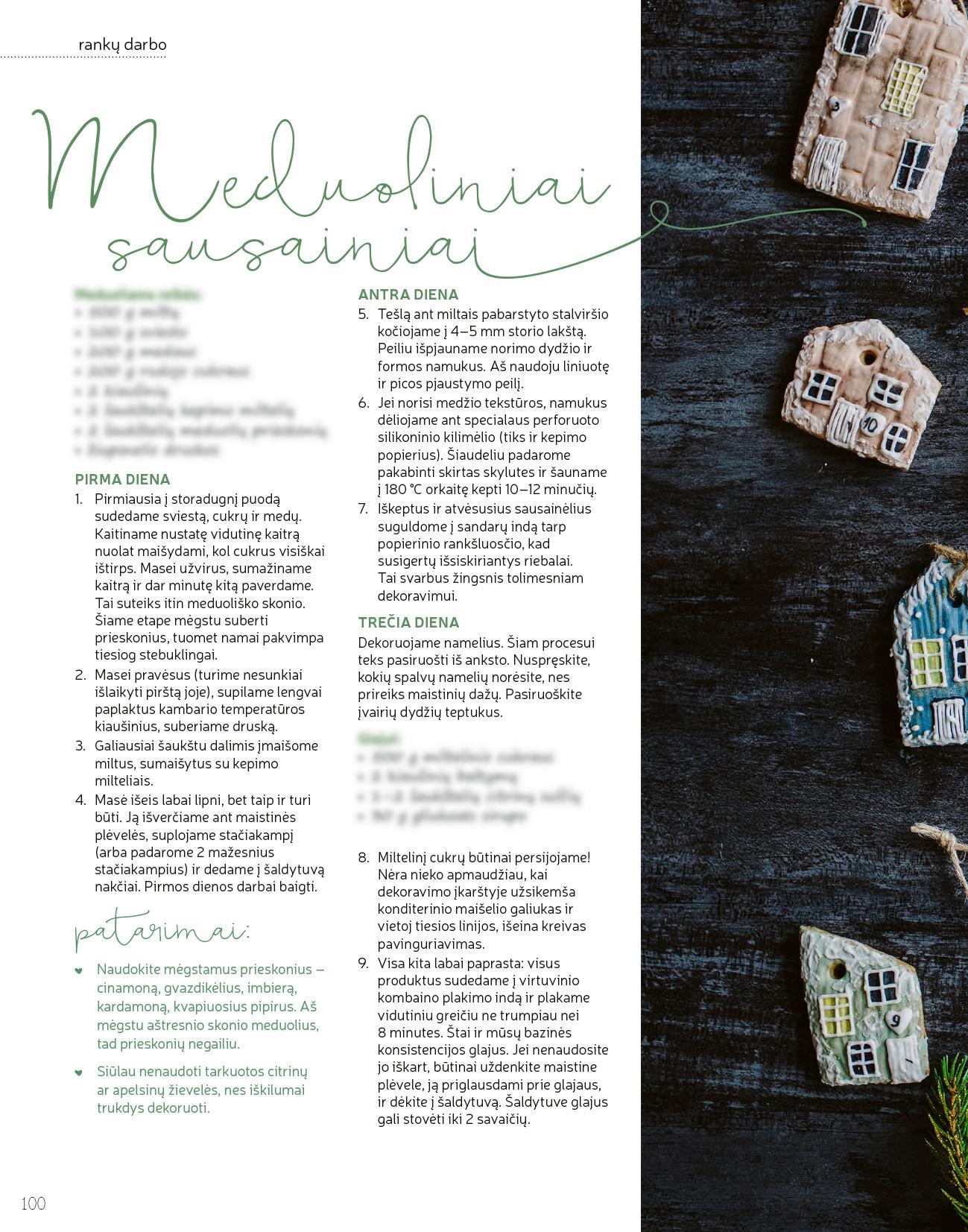 Šitos tešlos laikyti nereikėtų, kočioju dar šiltą ir per vakarą pagaminu tiek namukų, kiek tešlos būnu pasiruošusi. Prieskonius visada malu pati, nes šviežių kvapas nepakar tojamas.