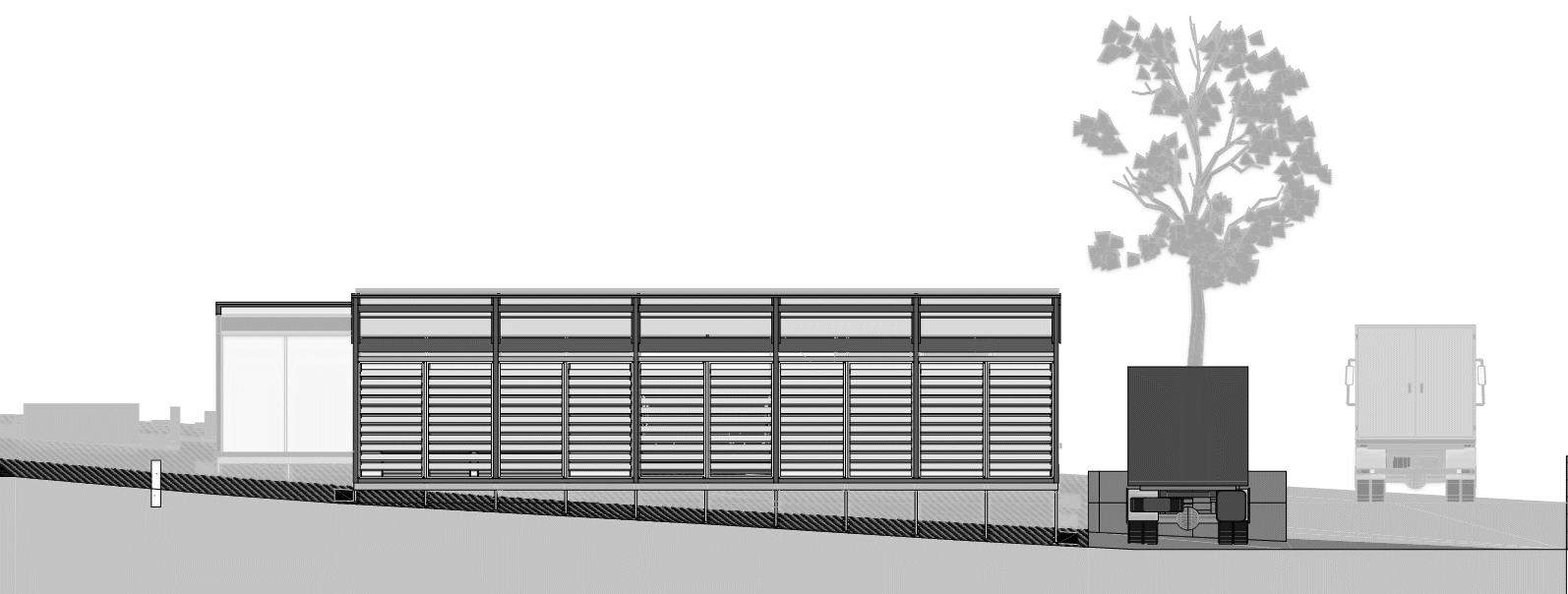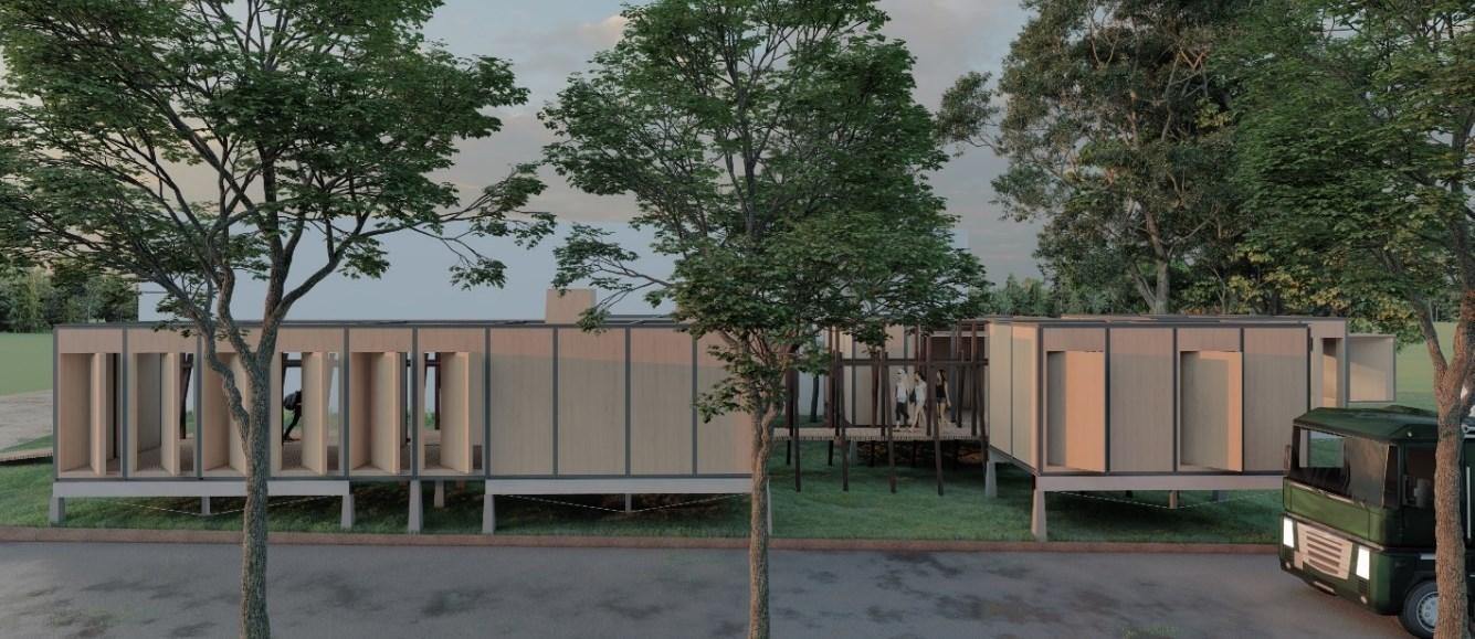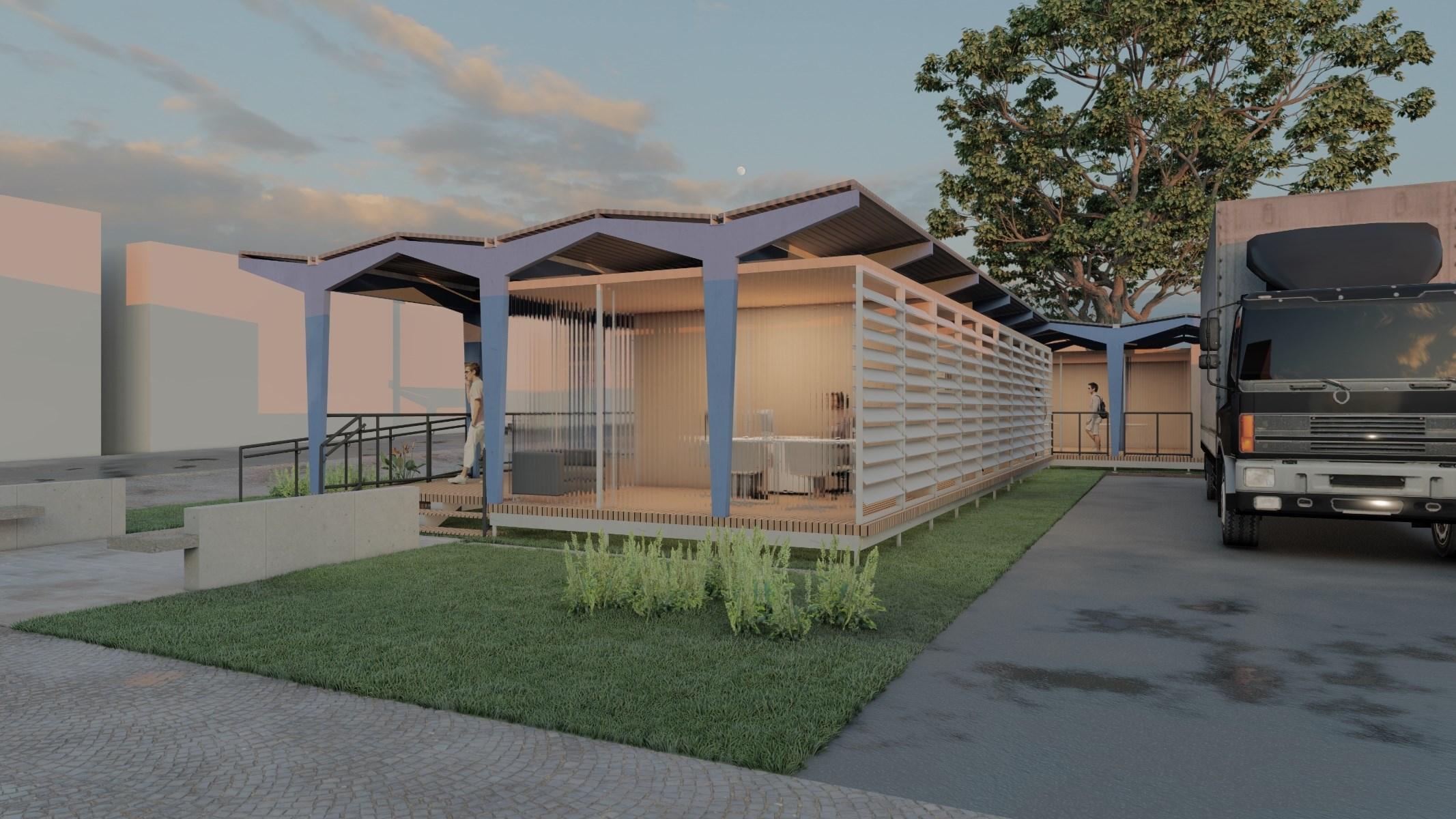 A partir das diretrizes determinadas para estudo de projeto, pôde-se analisar que a implantação da Portable Construction Training Center é realizada em locais de obras de construção civil, com o público alvo sendo os trabalhadores dessas obras. Seu sistema construtivo conta com treliças racionalizadas para sustentação da cobertura e estrutura metálica para as vedações laterais. Lateralmente, a obra conta com toldos translúcidos que podem ser abertos possibilitando iluminação natural e ventilação.