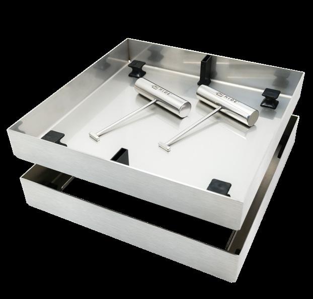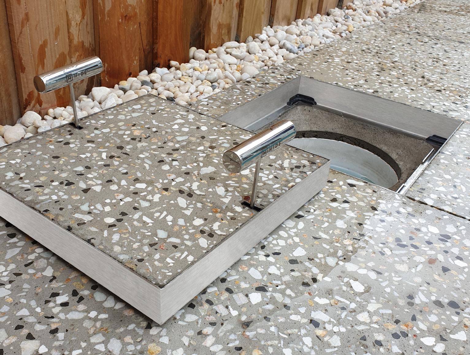 The HIDE® system seamlessly integrates your chosen exposed aggregate or polished concrete into the lid, allowing it to harmonize with the surrounding landscape for a sleek, uninterrupted appearance.