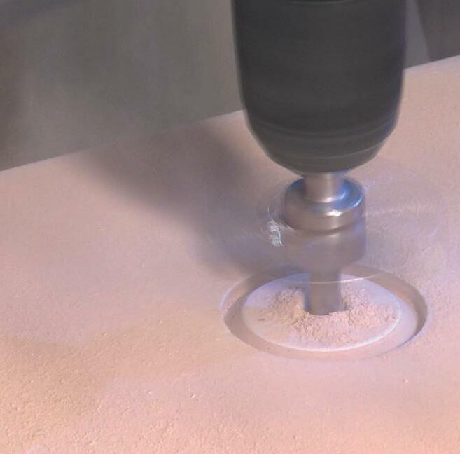 Place the tile over a stable and suitable work surface and score a small cross with a grinder, making sure to wear safety glasses, hearing protection and a respirator during the grinding and cutting. This will give you a centre point for the drill. Drill the hole using a hole cutter. These tools are available from your local Beaumont Tiles store.
