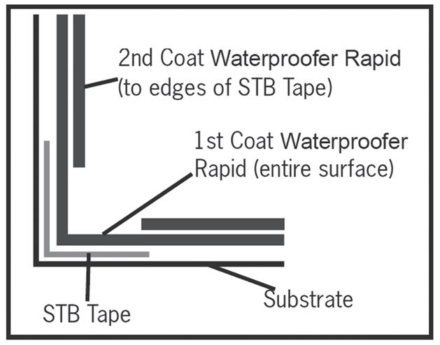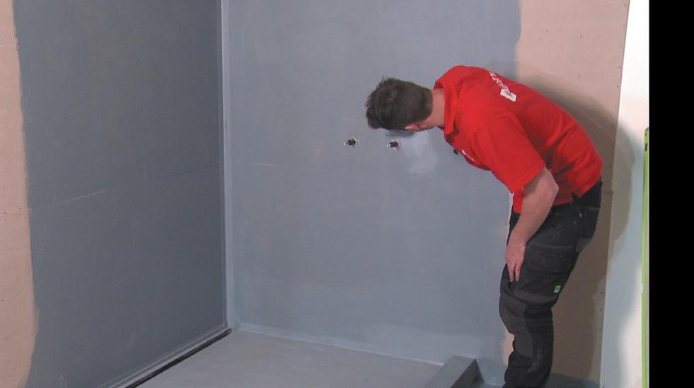 Waterproof walls and floors using waterproofer & waterproofing tape. Allow to cure prior to tiling.