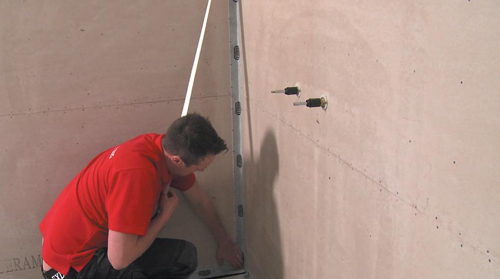 against any wall, usually one of the shower walls. Measure up one tile from this point, then rest batten on jacks or blocks. If there is no waterproofing (you cannot pierce this membrane), temporarily fix the batten to the wall 20mm below this spot, making sure it is horizontal by means of the level. Continue this right around the wall. When the adhesive is set, this batten can be removed. After the floor tiles have been laid, this last row is filled in. Almost every tile in this row is cut to allow for the gradient in the floor. If you are starting part way up a wall, e.g. above the bath, determine a starting point by measuring up from the base batten with tiles and fix another batten horizontally to the wall.