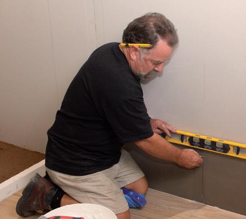 level and use a damp cloth to wipe away any excessive adhesive that squeezes onto the tile. Any cut tiles and larger size tiles can have the adhesive “buttered” on the back to make them easier to place. Every so often, it is a good idea to pull a tile off to ensure you are getting complete adhesive coverage on the back of the tile.