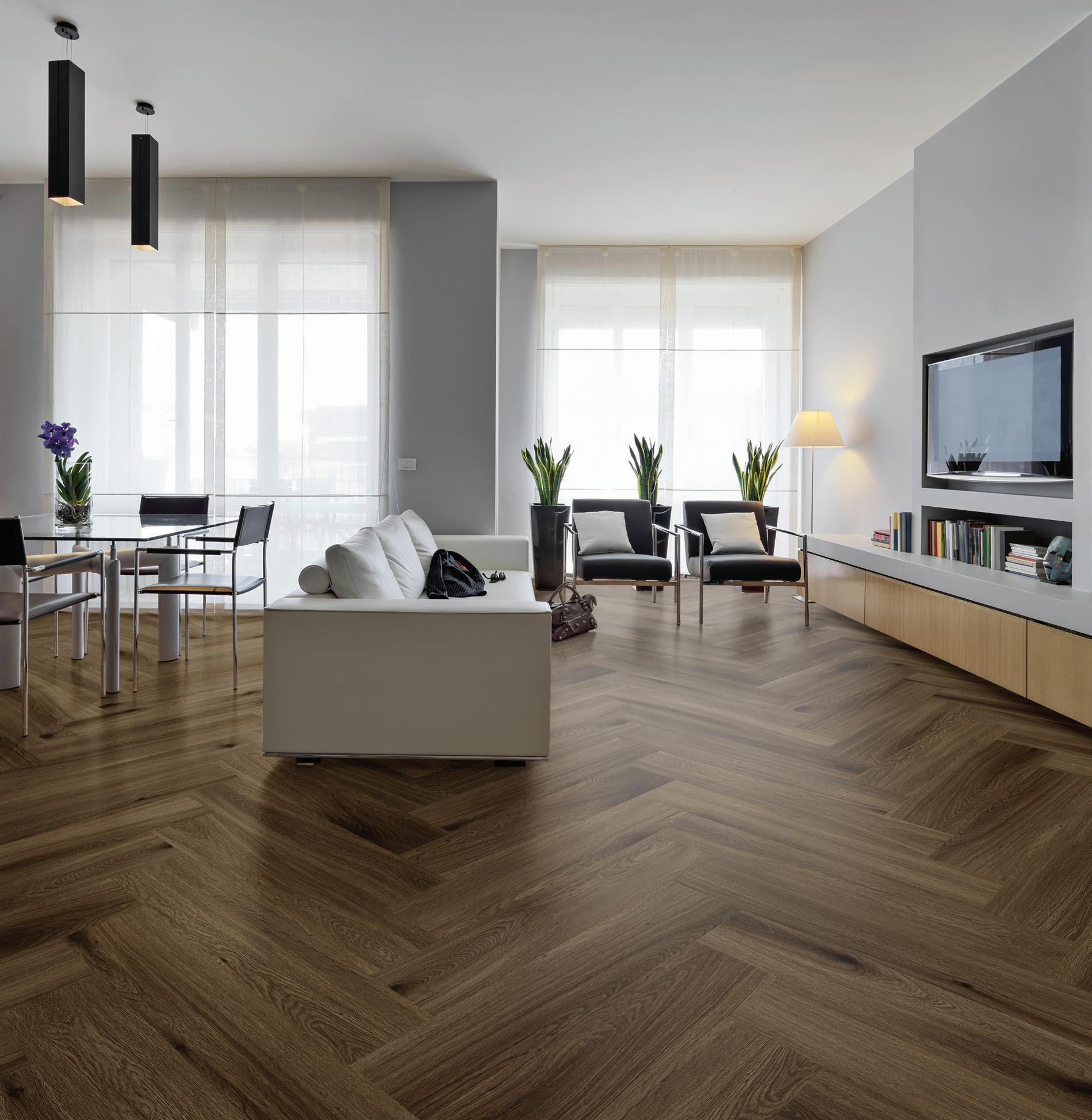 Elevate your next project with the warming timber tones and regal timeless elegance of a Herringbone pattern, with our Charm hybrid flooring range