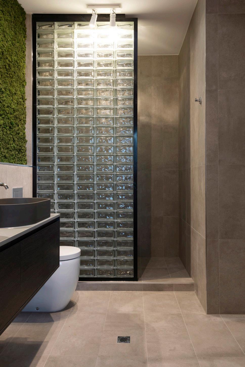 The bath was replaced with a glass brick walk-in shower, two crisp side by side vanities were added along with a dry grooming station. Luxurious floor to ceiling tiles, floating mirrors and a knockout blow from Paddy with a petrified moss feature wall.