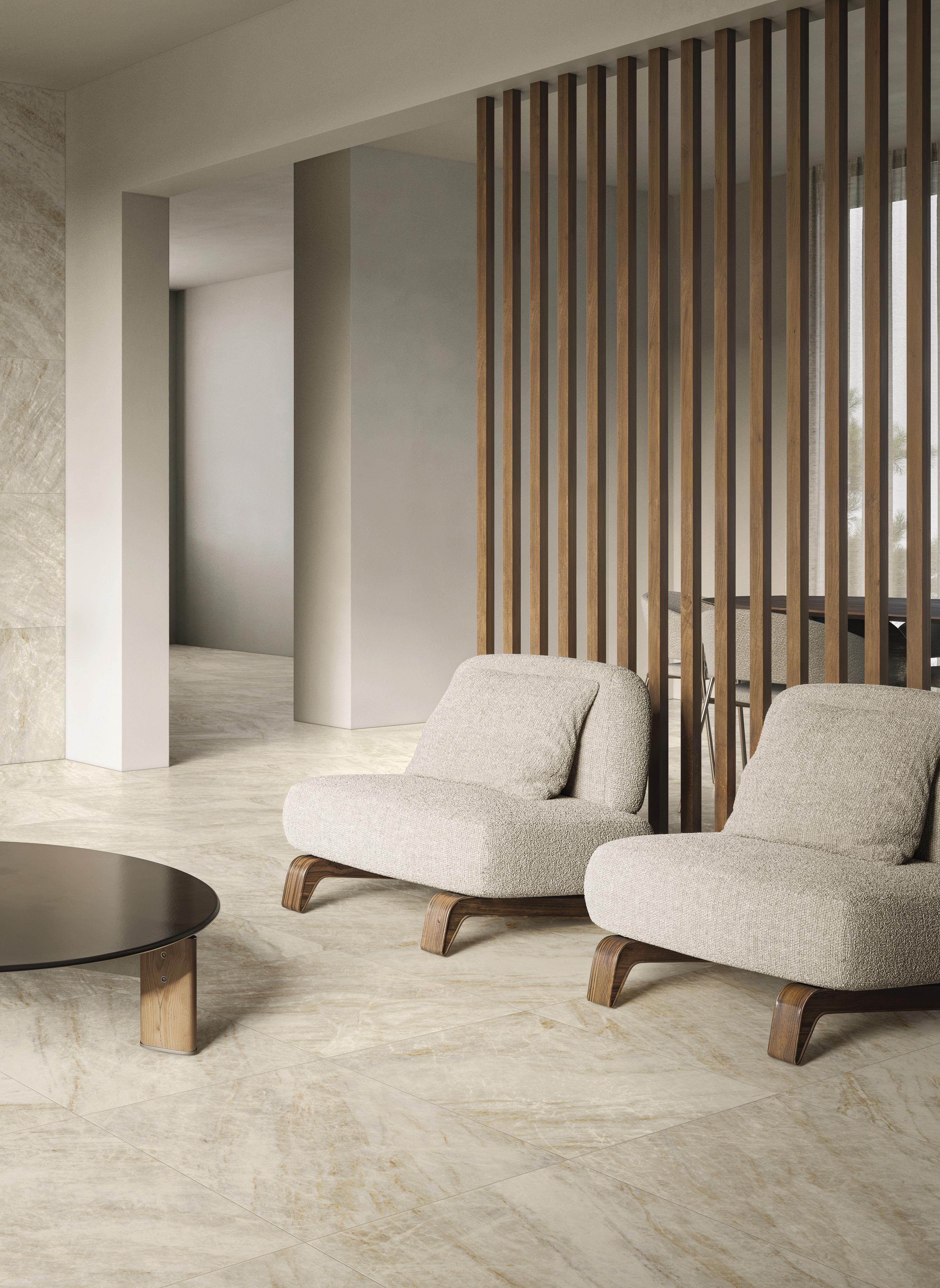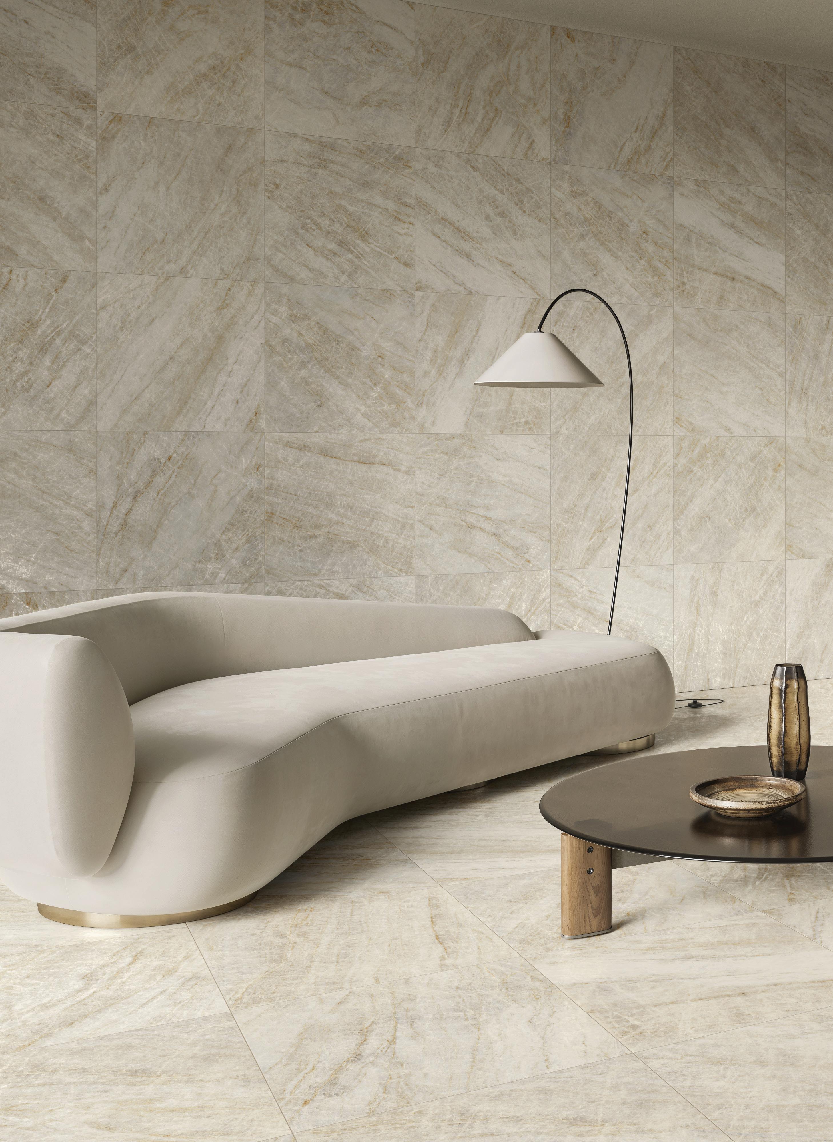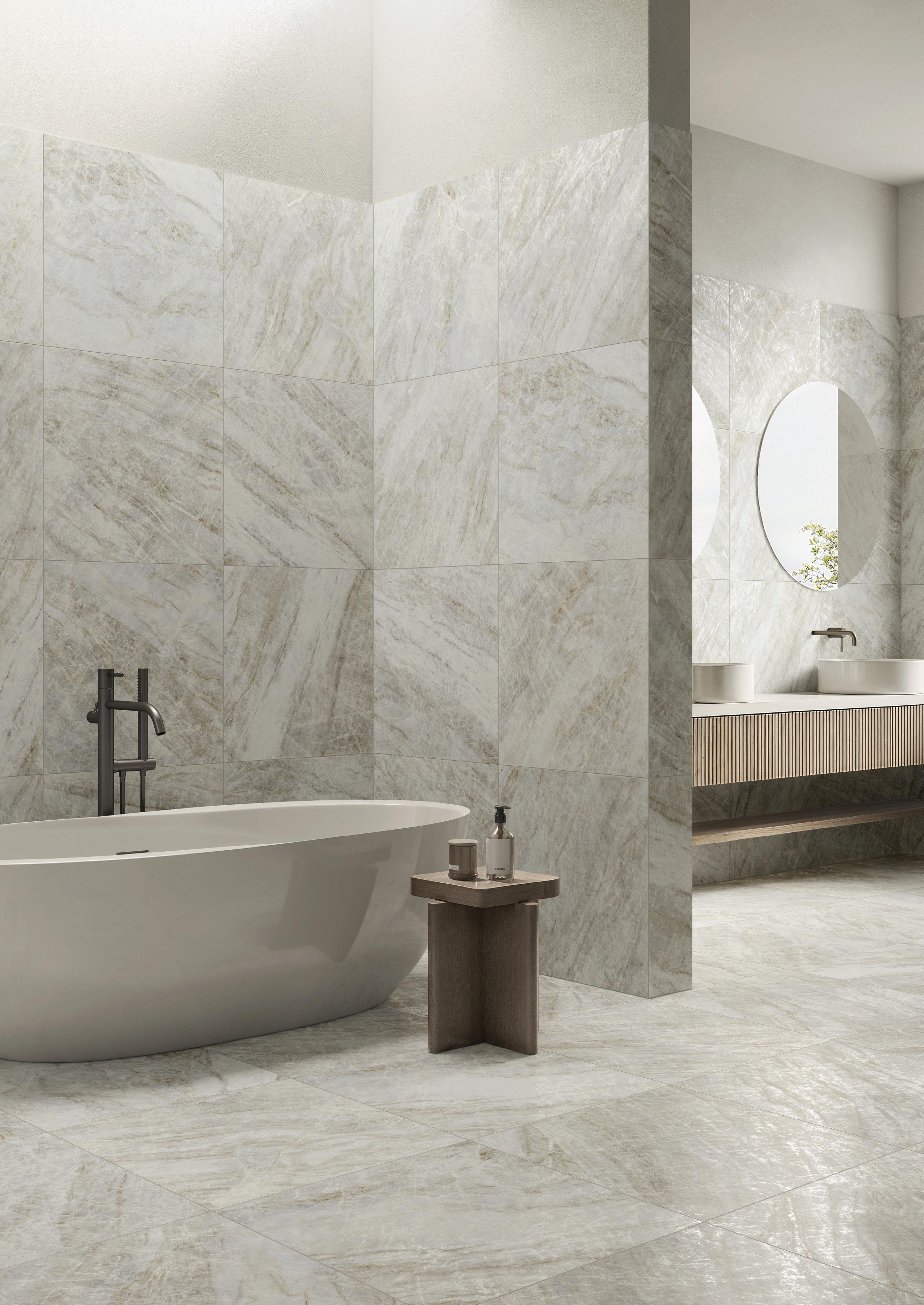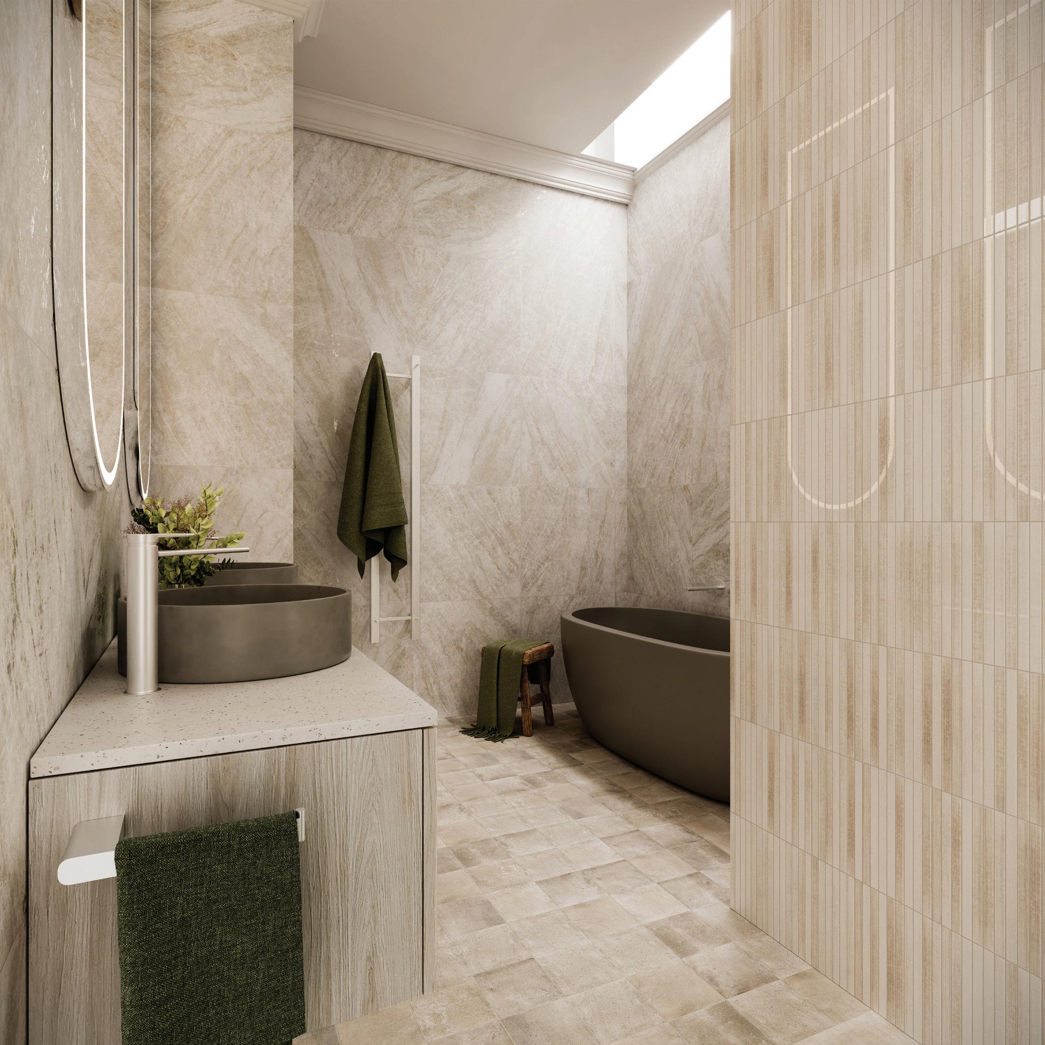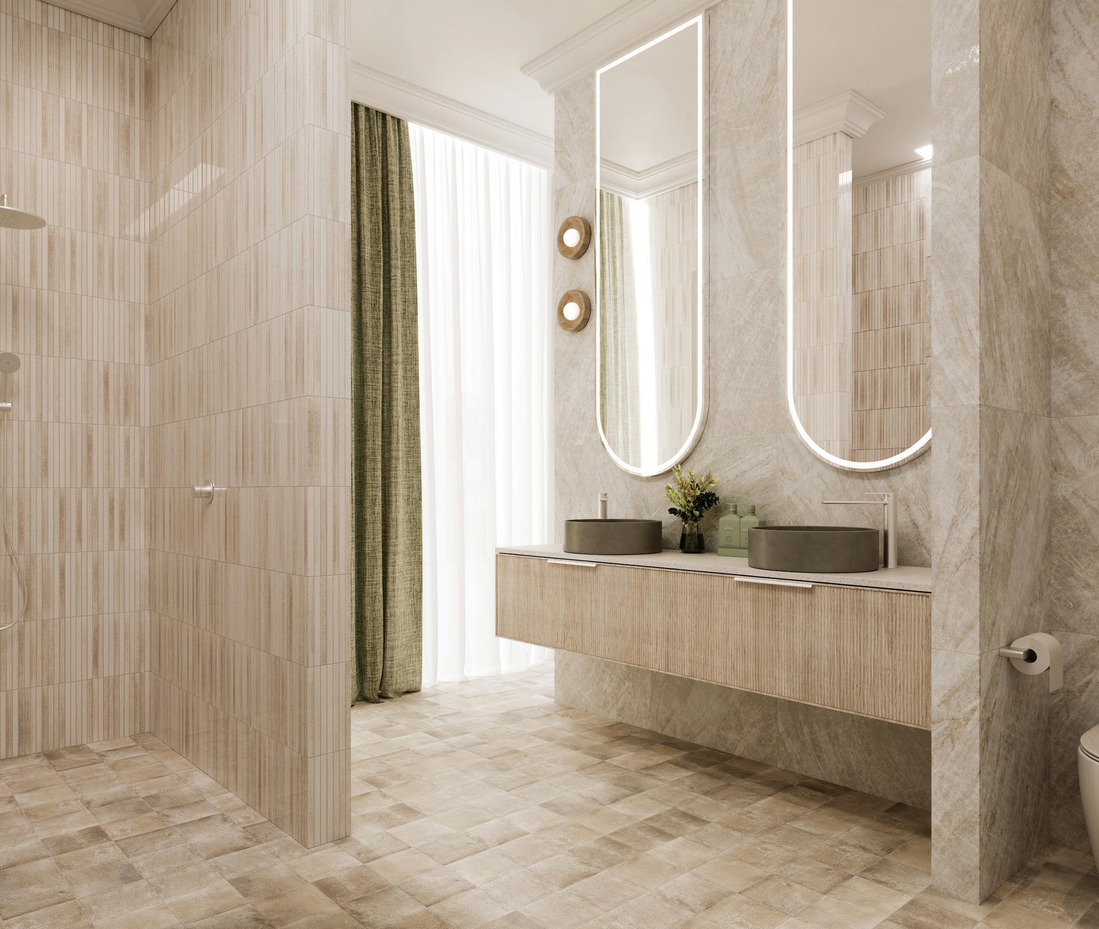 Inspired by nature’s effortless harmony, Oyster is the groundbreaking tile range chosen as our 2026 Tile of the Year. Oyster Beige walls bring that luminous, Taj Mahal–inspired movement, grounded by Tuscano Sand underfoot, while the KitKat Honey feature adds warmth, gloss and just enough edge.
