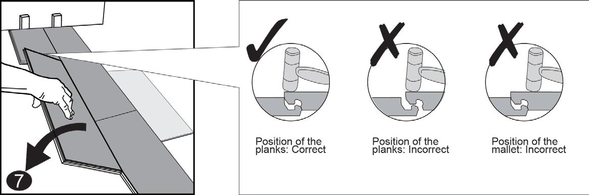 IMPORTANT: If you notice both planks aren’t at the same height or are not well-locked together, please follow the disassembling instructions at the bottom of the page, disassemble, and check if any debris stuck inside the lock is obstructing. Failure to properly line up the end joint and attempting to force it in while out of alignment could result in permanent damage to the end joint.