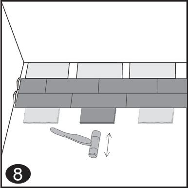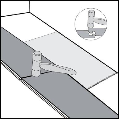 Note: Tapping the area close to the short edge, but not directly above it, may result in permanent damage to the joint. Continue installing the first row until you reach the wall on the right.