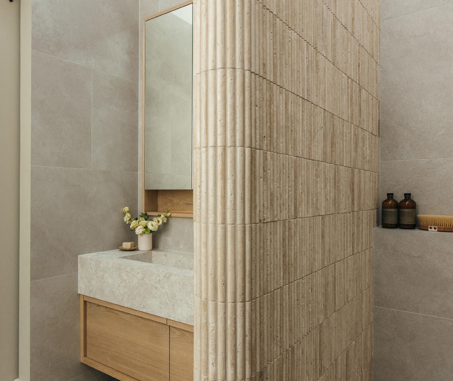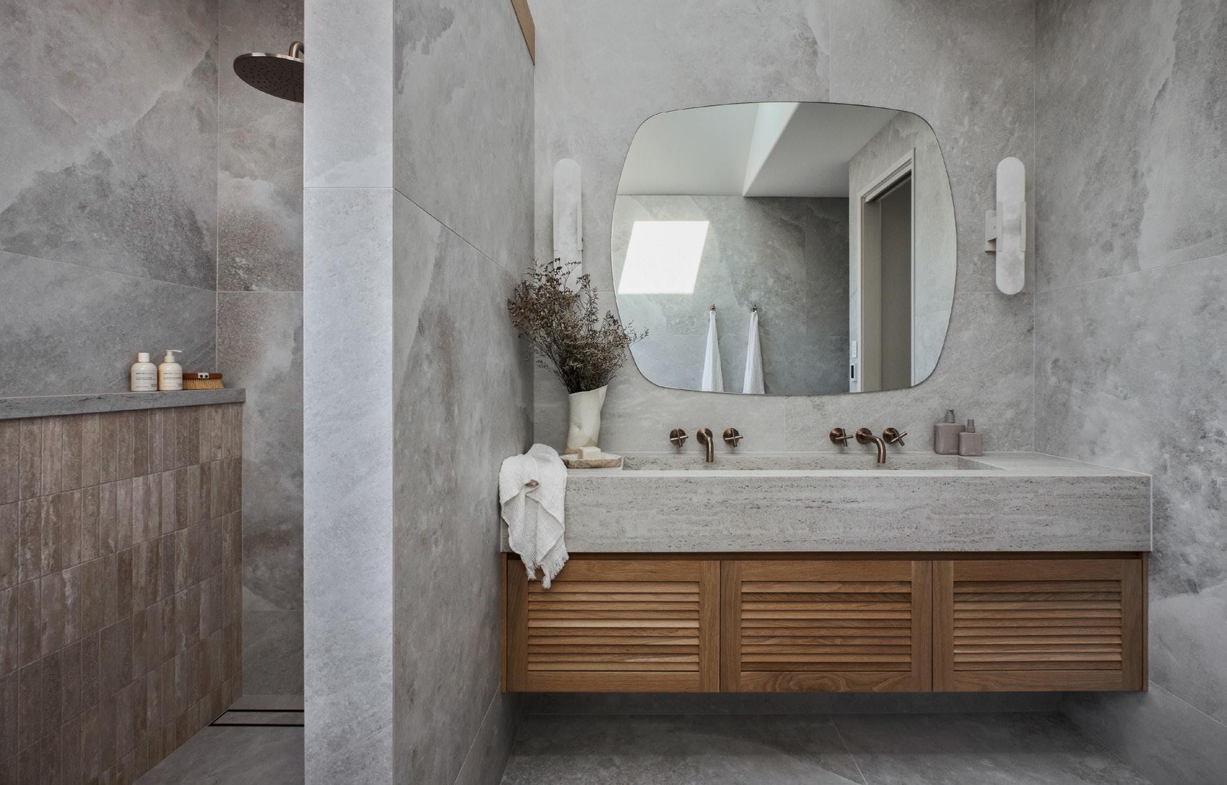 Kyal & Kara chose the stunning Rock salt tiles throughout both houses! Inspired by natural rock formations, this porcelain tile range features a rich, matte finish and defined veining, adding depth and character to the space.