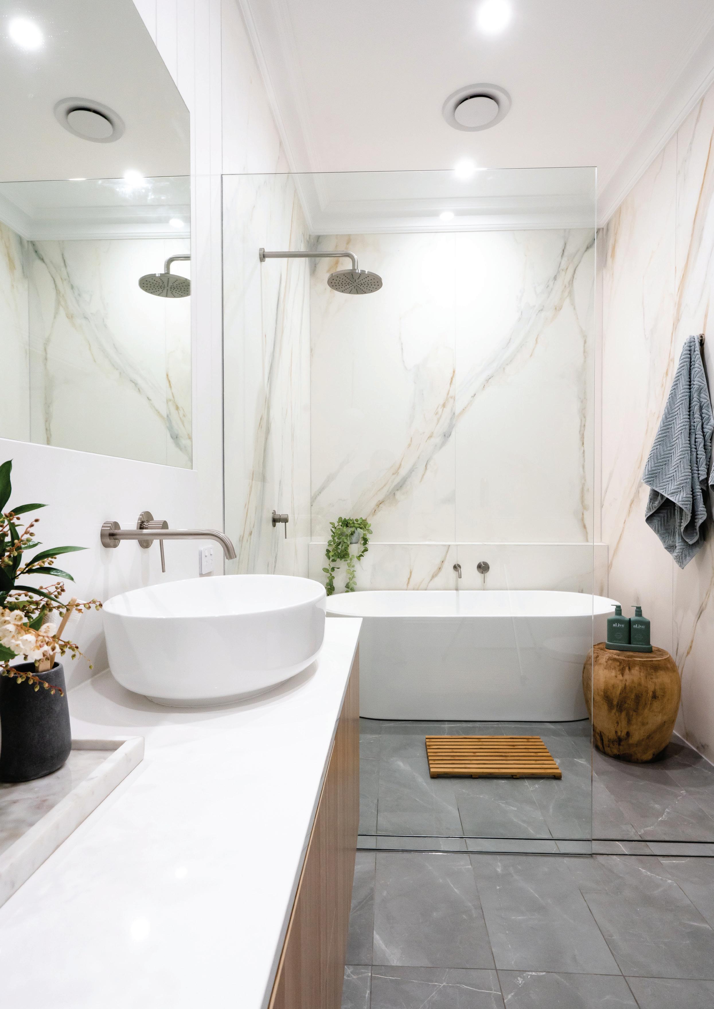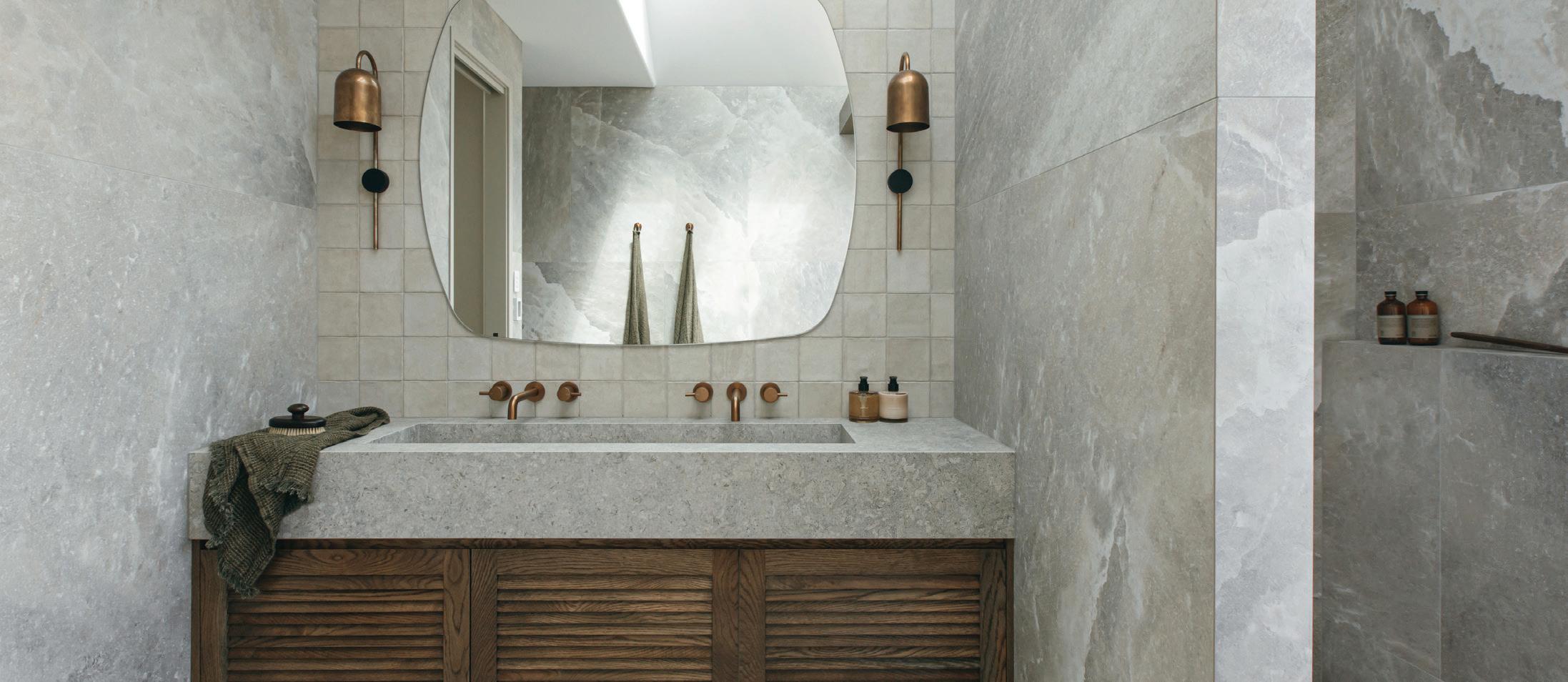 Lucy chose slabs for her family bathroom because they “Make this bathroom! They frame the wet room and are grand and elegant. I love them because they are so incredibly easy to clean thanks to their large format and minimal grout lines. We took the grey tones that run through the slabs and selected the grey floor tiles to anchor the look.”