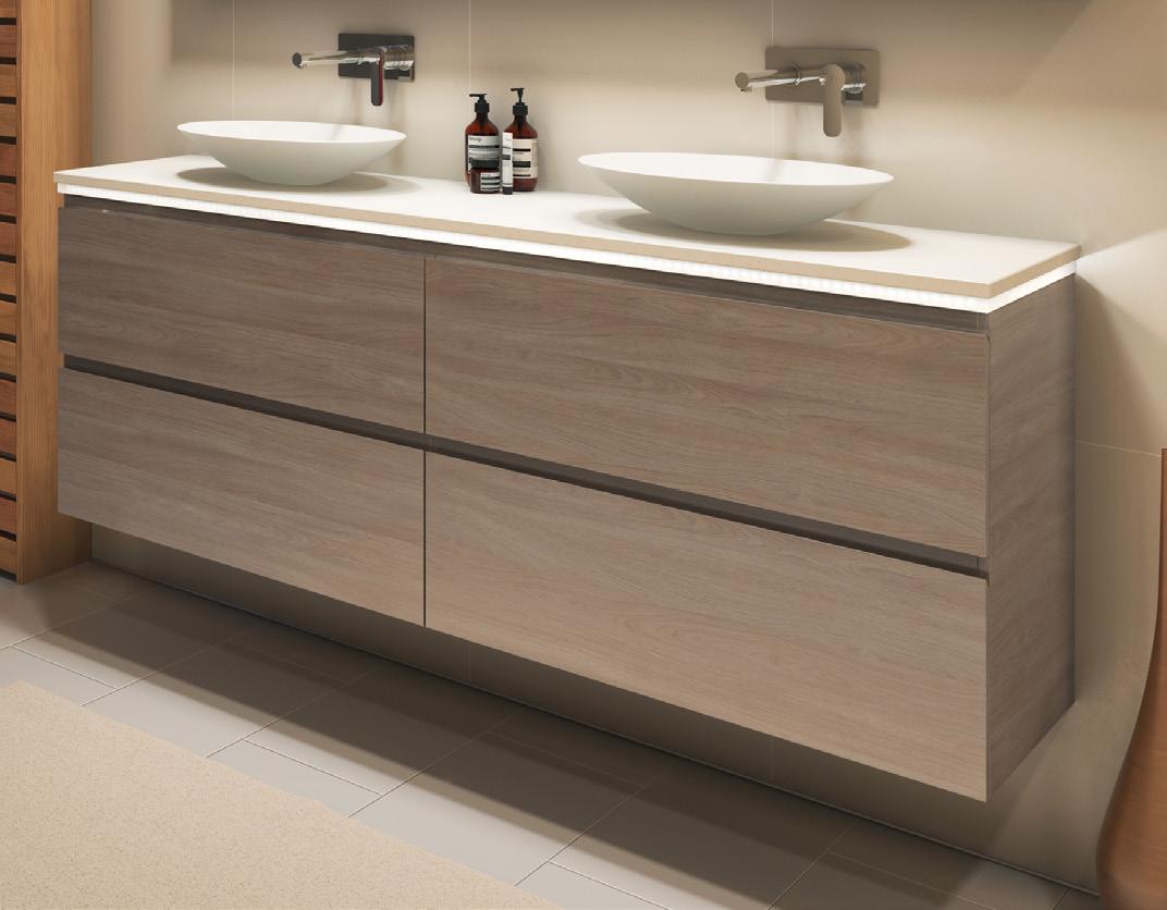 01. VALE • Classic White interior with bamboo finger jointed storage trays • European soft-close full extension drawers • Classic 2mm horizontal routed fronts • Finished in our painted 2 pack polyurethane hardening process. Available in any of our standard painted colours • Colour match almost any paint colour of your choosing (additional charges apply) • Top options: - 20mm integrated Alpha Ceramic top - 20mm integrated Regal Mineral Composite top - 20mm integrated Haven Matt Dolomite top (selected sizes) - 20mm integrated Quest Gloss Dolomite top (selected sizes) - 20mm SilkSurface and 20mm Caesarstone slab top with above or under counter basin/s Gold Inclusions 10 YEAR WARRANTY | EUROPEAN DRAWERS EXCLUSIVE TO BEAUMONT TILES | FEATURES INCLUDE 26 | Beaumont Tiles Exclusive Vanities VANITIES