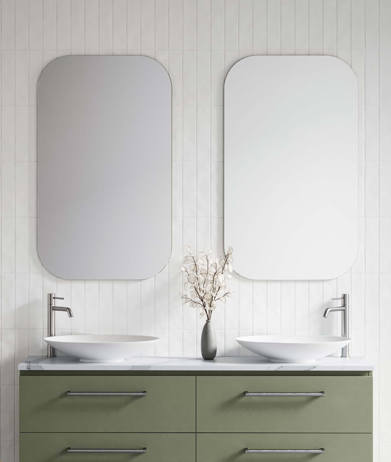 Enhance your bathroom with the elegant Heathcote mirror, designed with soft, curved corners for a gentle touch. It can be mounted either horizontally or vertically to seamlessly fit your space.