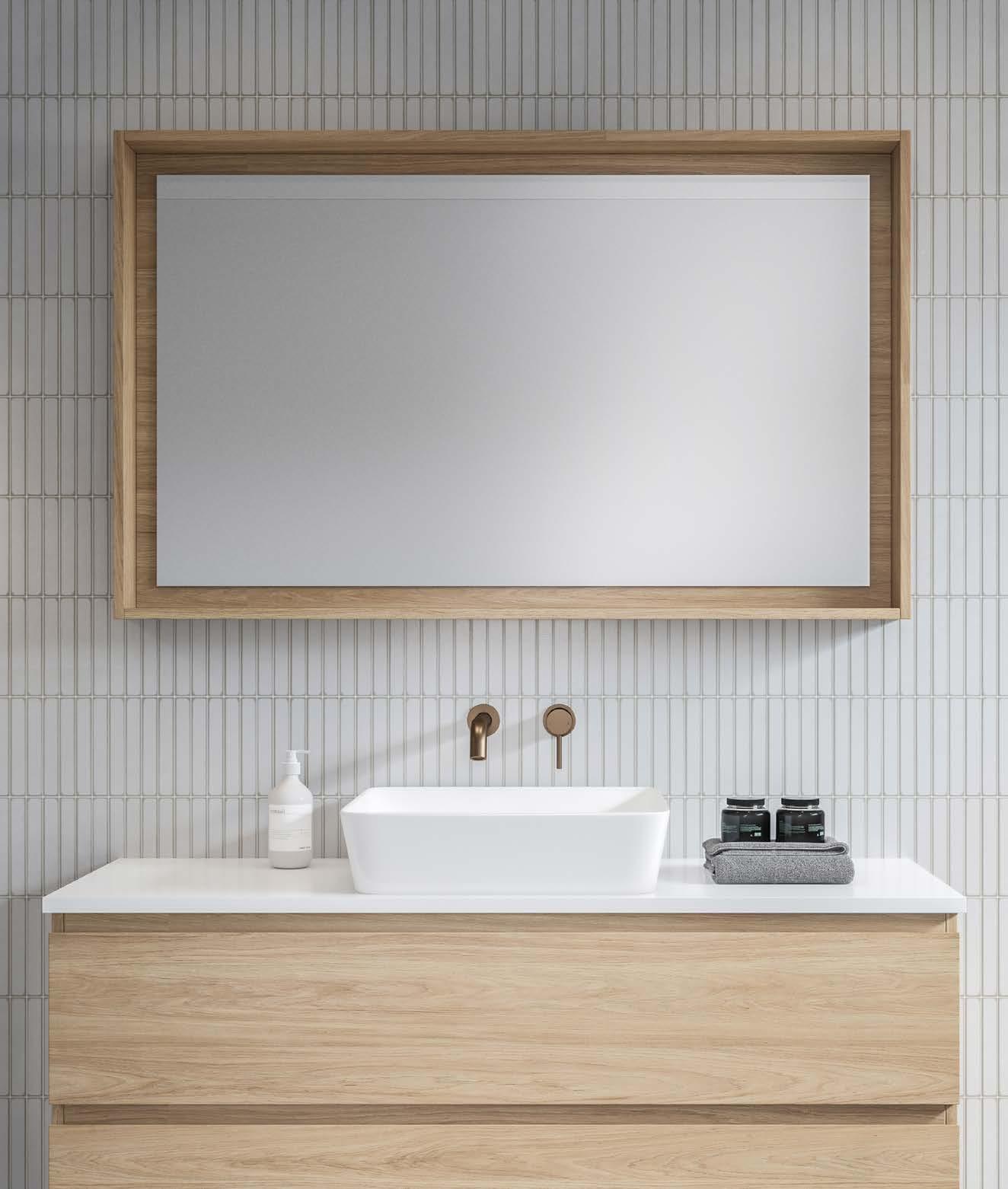 Enhance the aesthetic of your bathroom by coordinating the finish of your Brooklyn mirror with your vanity, or add visual interest by selecting a contrasting colour. For added functionality and style, add lighting surround (additional charges apply).