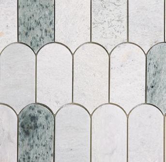 Wendy completed the look with a feature panel behind the vanity featuring our Cascade Orient Green! Den tiled the porch with our show stopper Sync Circle Green!