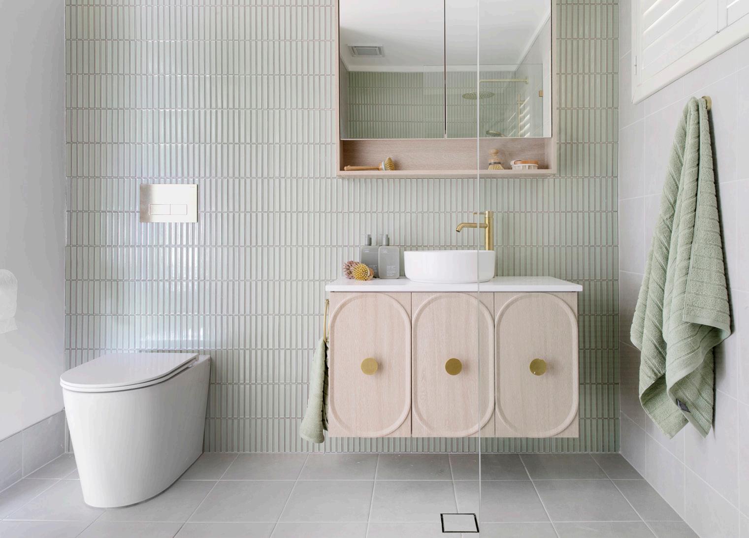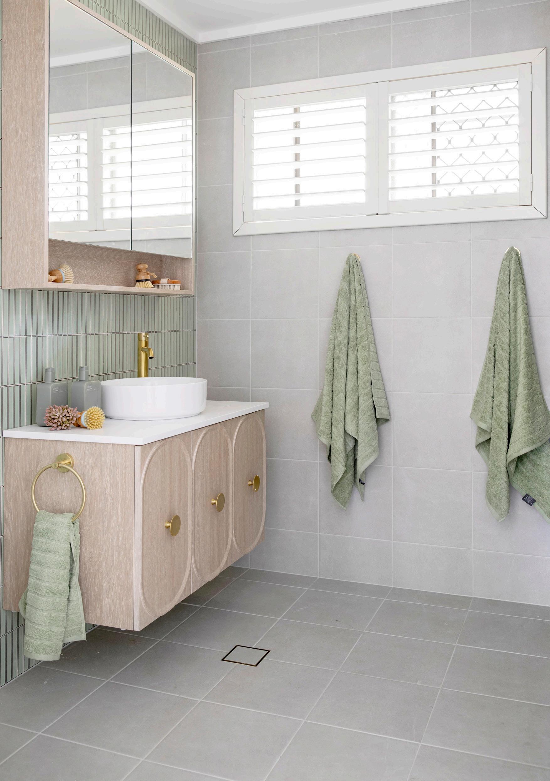 A mix of tile size, texture and colours were complimented with a white basin, green vanity, and brushed brass hardware. And to complete the look Wendy had designed a feature panel to go behind the vanity.