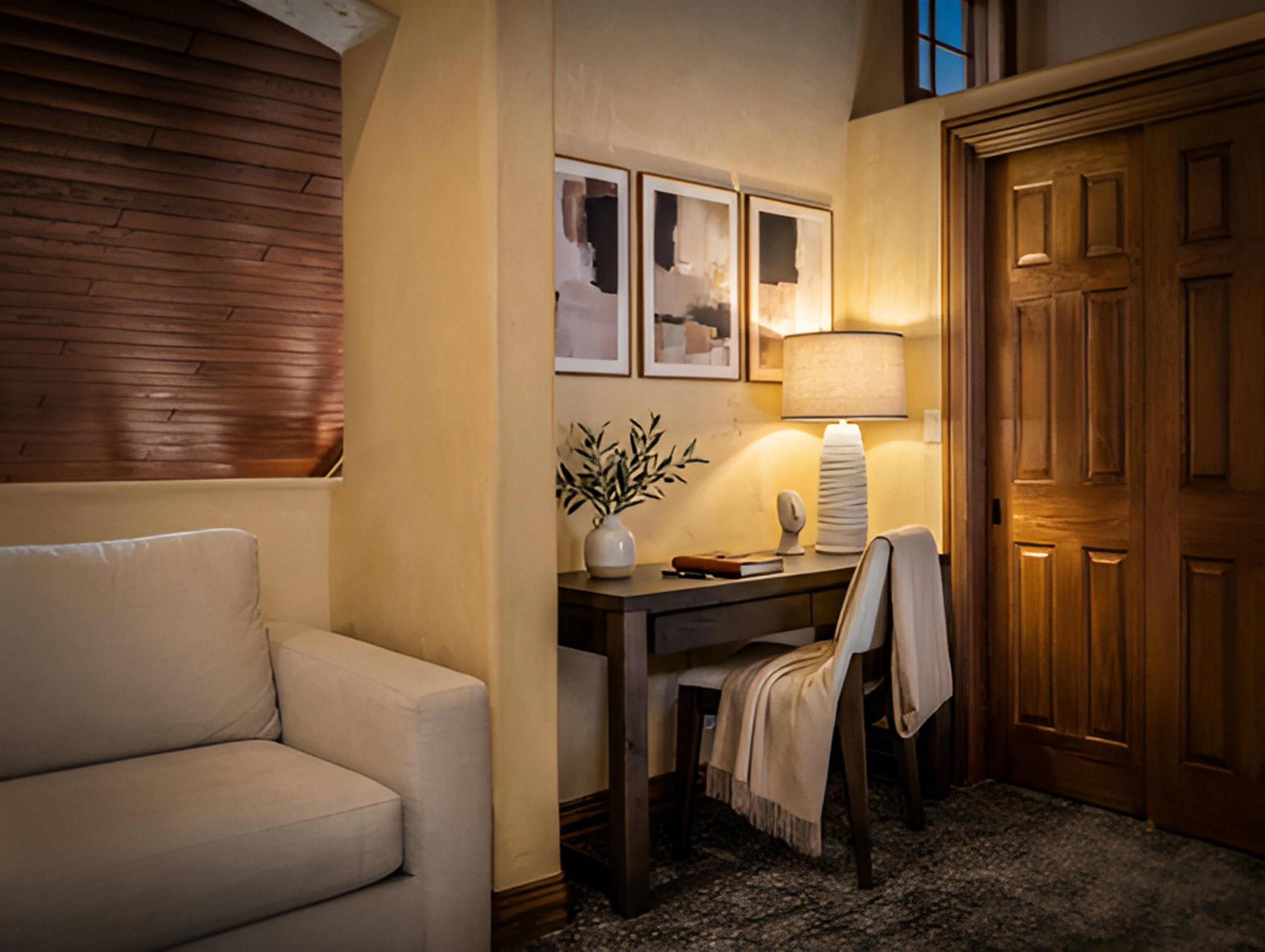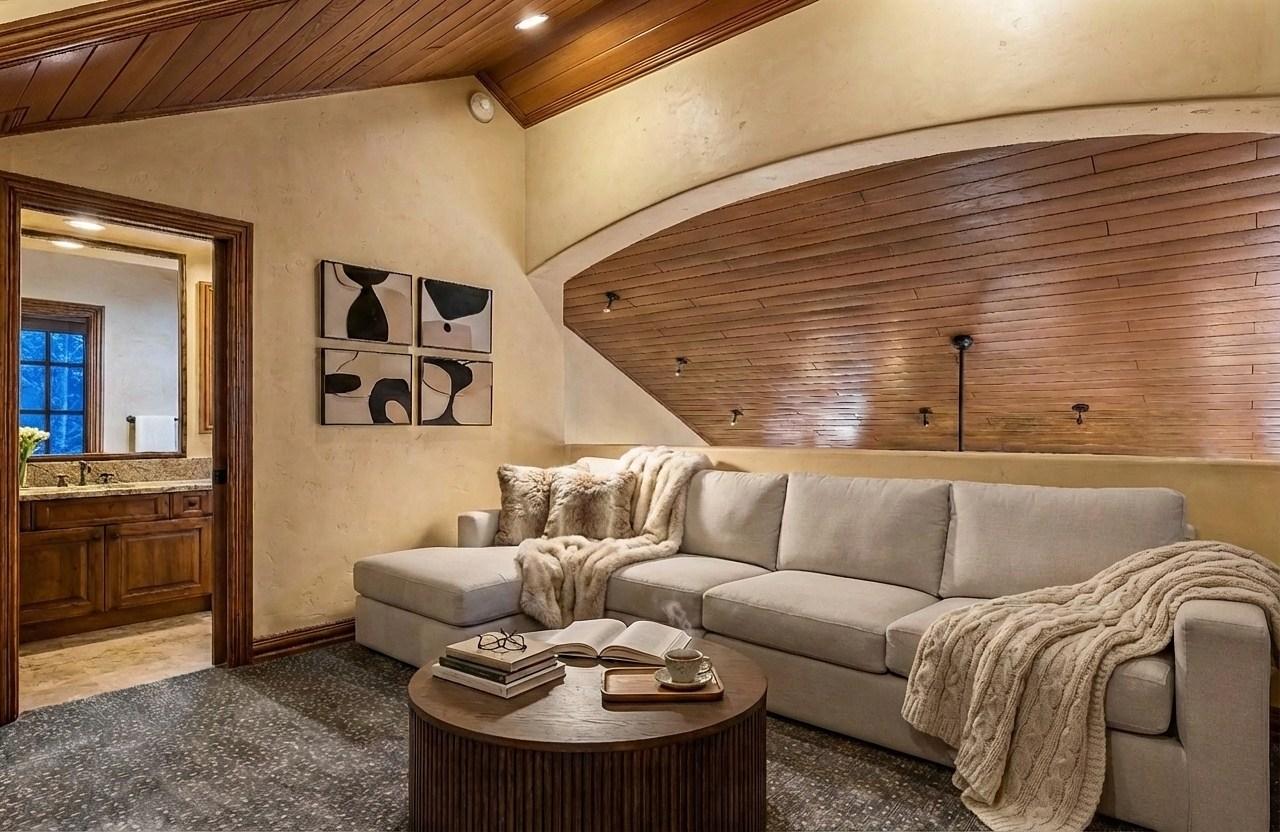 Morning light pours across integrated plaster walls, warming spaces shaped by intention and quiet luxury. The great room opens like a breath with vaulted tongue -and -groove ceilings lifting your gaze upward, a moss -rock fireplace anchoring the room with its steady glow. It ’s a place where winter evenings stretch long and gentle, where laughter settles into the corners, and where the mountains outside feel close enough to touch. Thoughtful luxurious updates bring a sense of calm refinement: designer wool carpeting underfoot, refreshed bathrooms and kitchen, updated flooring, and a dedicated coffee station that turns simple rituals into small celebrations. The open loft invites possibility — family room, study, creative refuge —whatever your life needs in the moment.