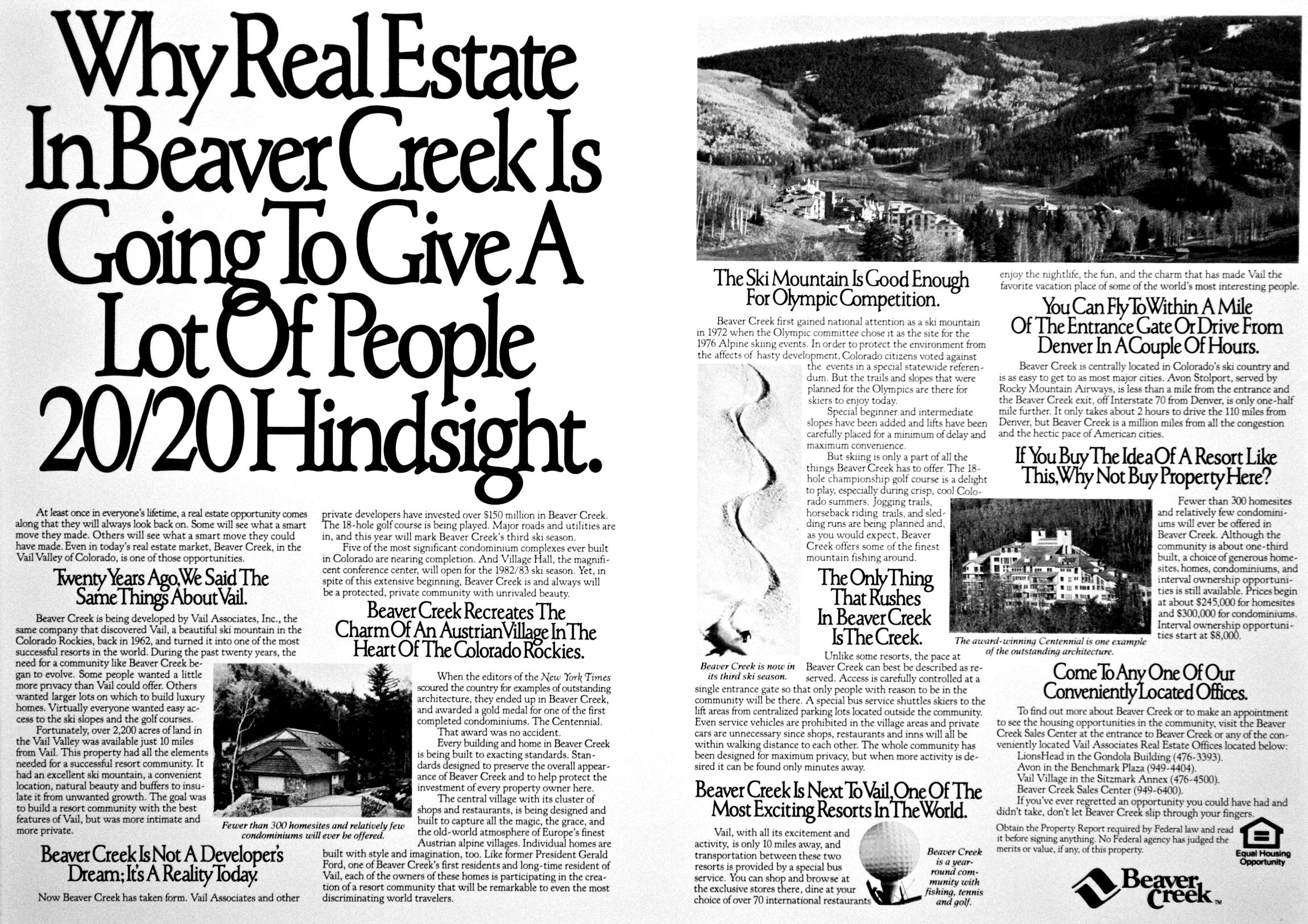 When George Townsend first settled in the Valley in 1881, he knew he ’d found something special, an exceptional mountain, lined with aspen groves and beautiful vistas that would become a world renowned destination. In 1972, Vail continued its vision by purchasing the land and began designing a resort that combined western hospitality and European charm. Obstacles delayed resort completion, but on December 15, 1980, Beaver Creek finally opened to the public.