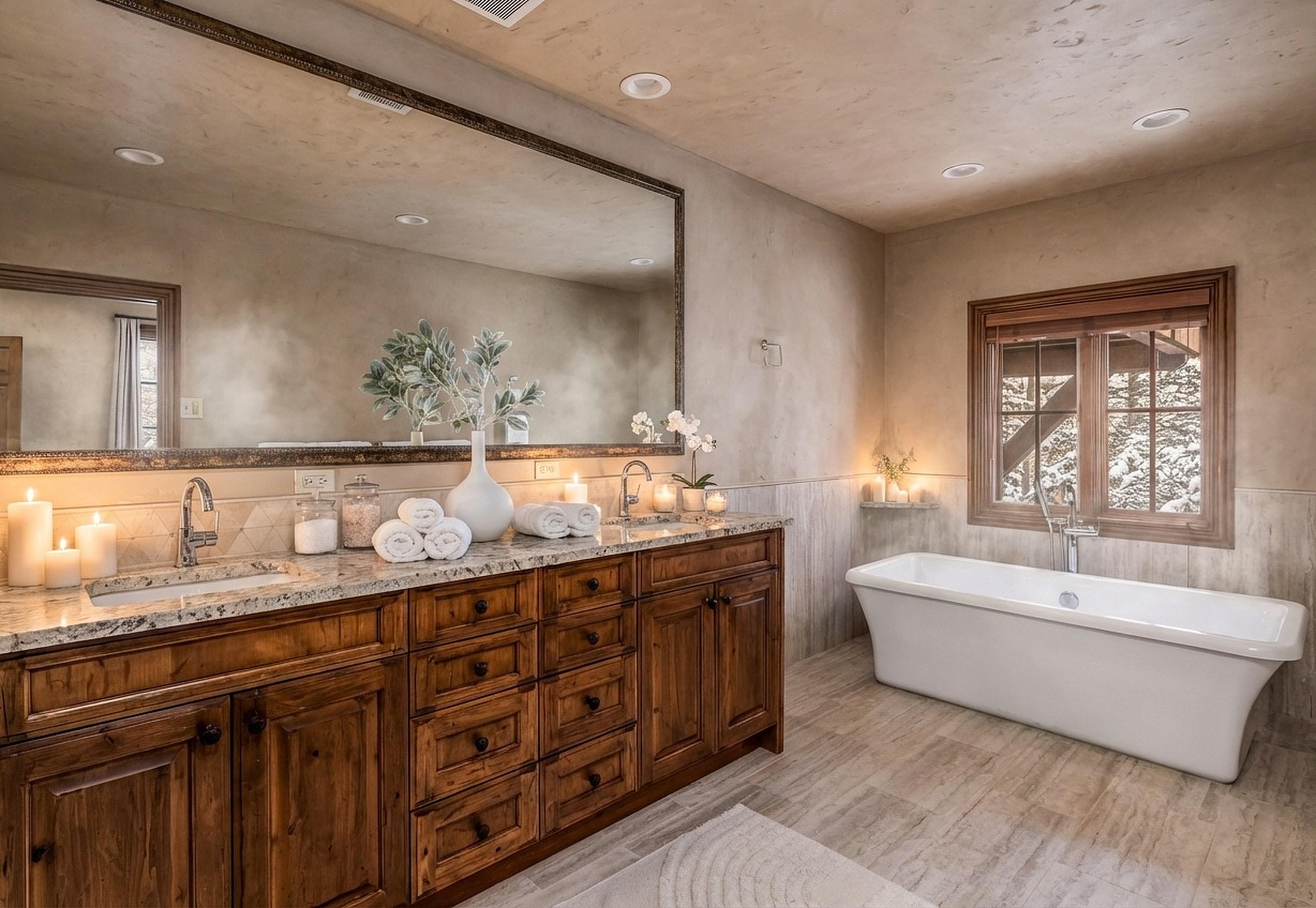 Morning light pours across integrated plaster walls, warming spaces shaped by intention and quiet luxury. The great room opens like a breath with vaulted tongue -and -groove ceilings lifting your gaze upward, a moss -rock fireplace anchoring the room with its steady glow. It ’s a place where winter evenings stretch long and gentle, where laughter settles into the corners, and where the mountains outside feel close enough to touch. Thoughtful luxurious updates bring a sense of calm refinement: designer wool carpeting underfoot, refreshed bathrooms and kitchen, updated flooring, and a dedicated coffee station that turns simple rituals into small celebrations. The open loft invites possibility — family room, study, creative refuge —whatever your life needs in the moment.