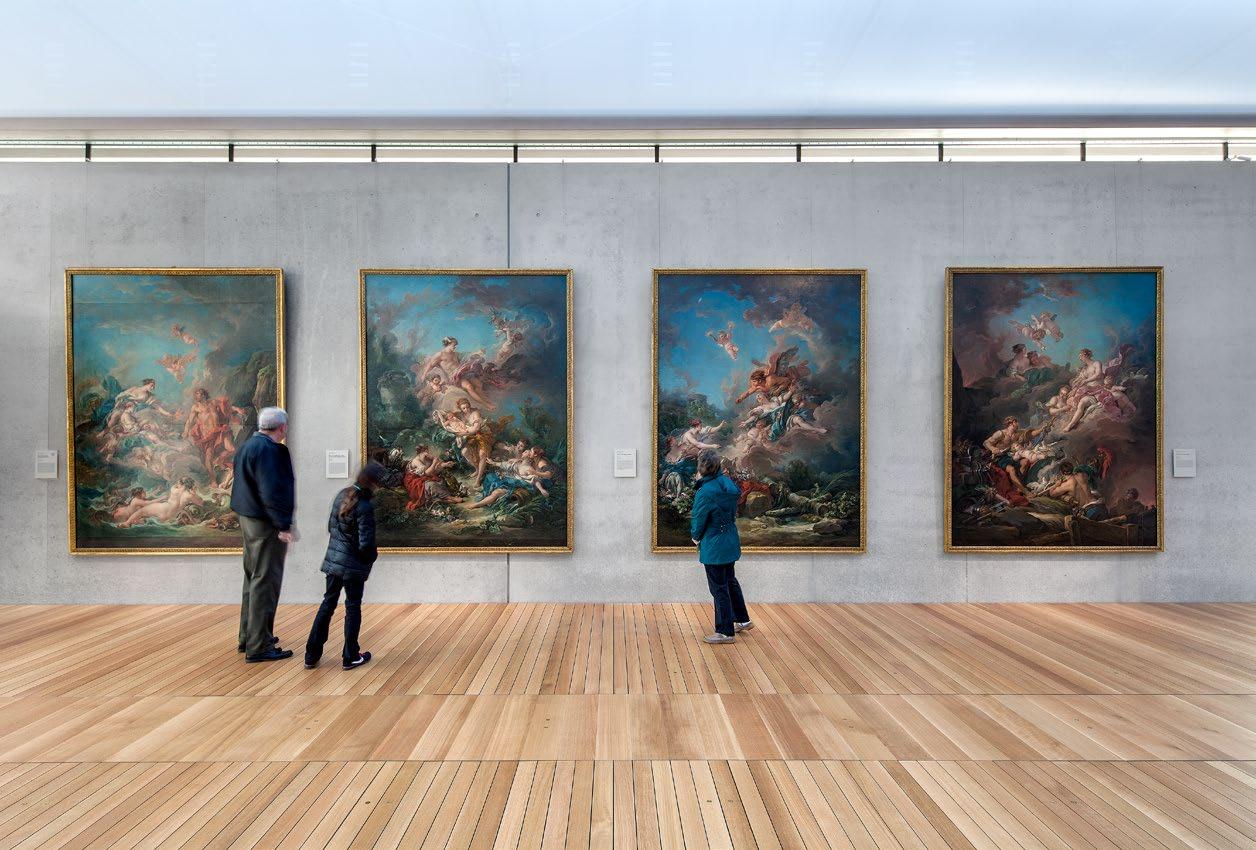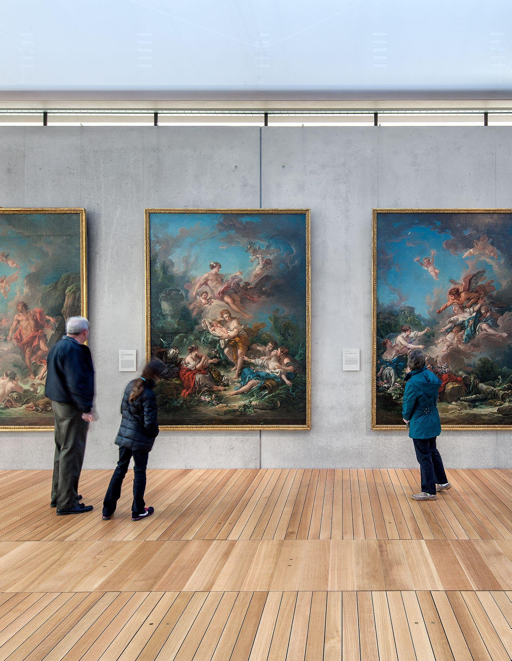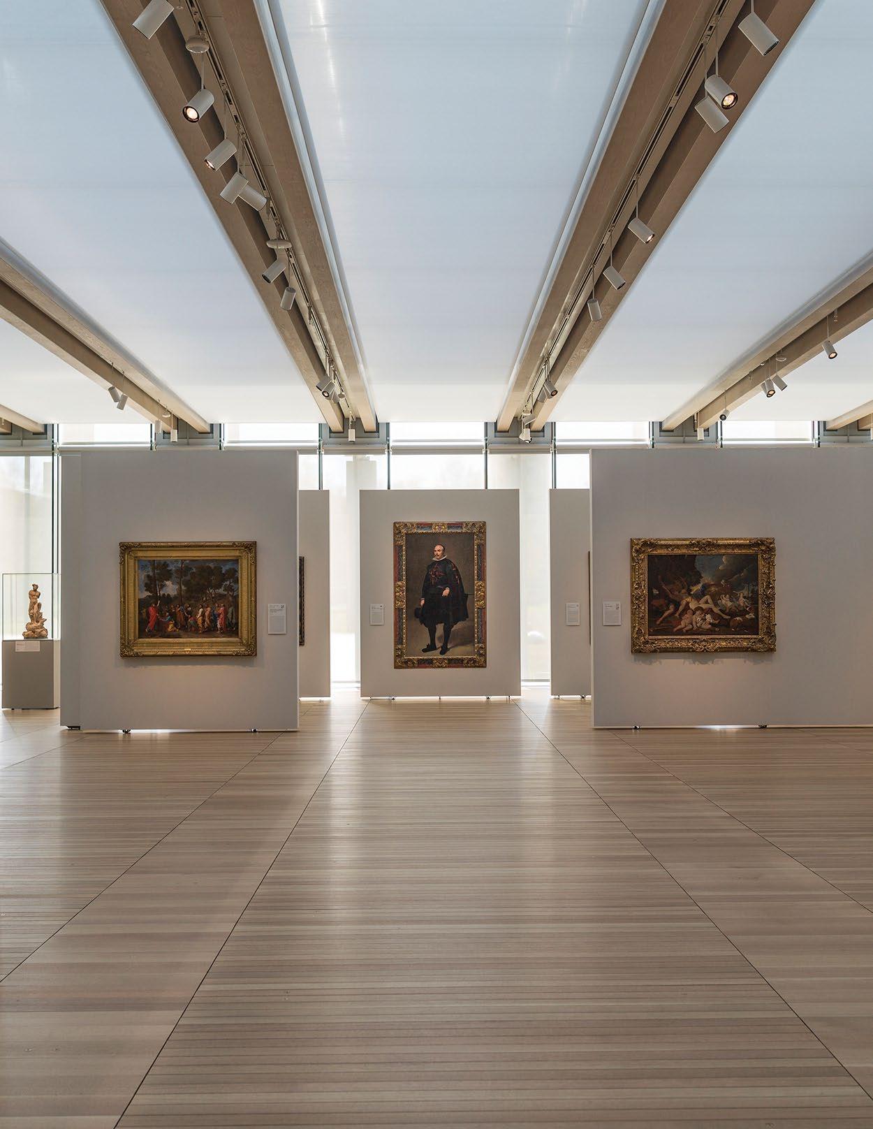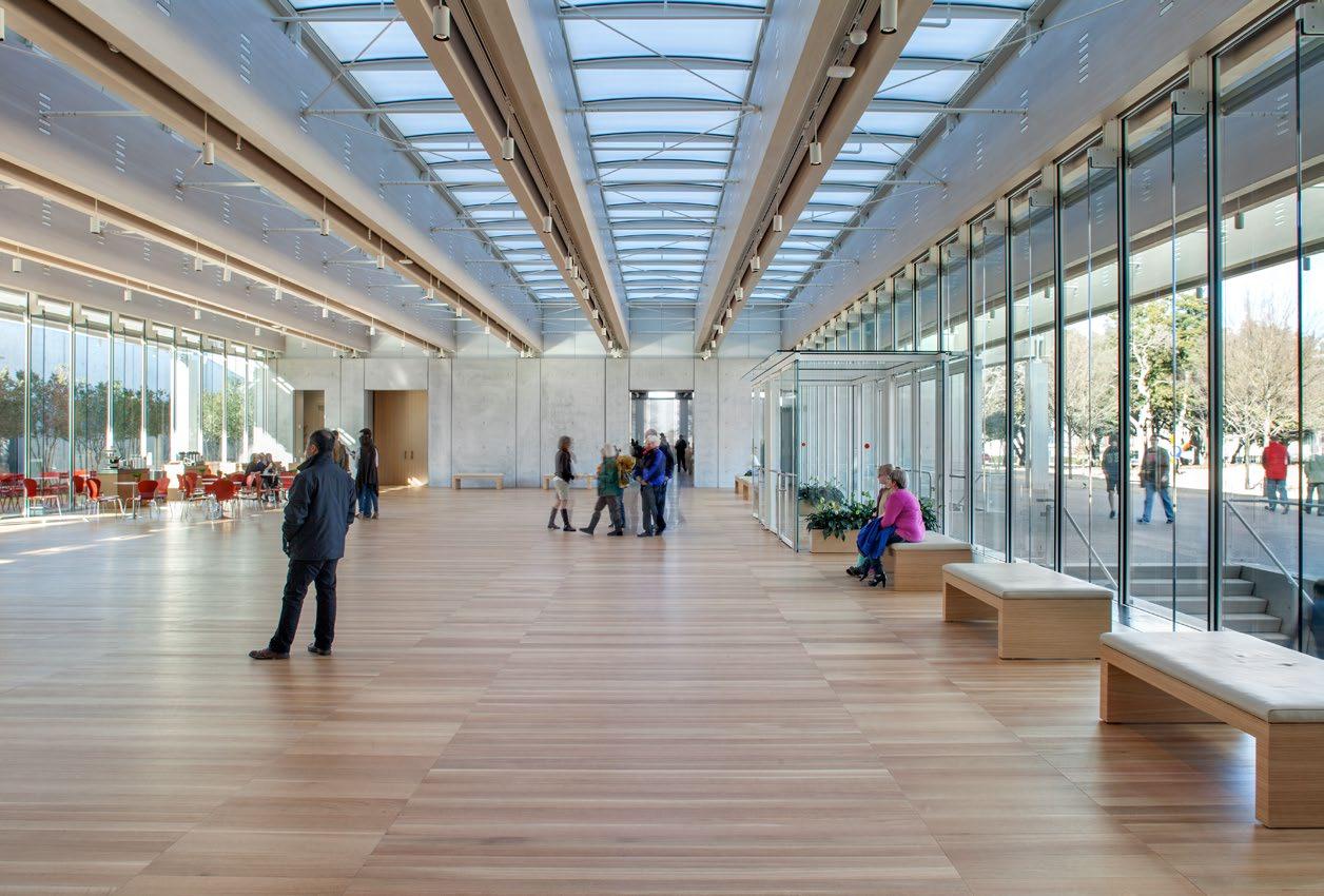 Nearly two-thirds of the building resides underground, housing the auditorium, library, offices, and art storage. The pavilion features a transparent, airy facade and reestablishes the museum’s west side as the primary entrance. Signature architectural elements include exceptionally smooth concrete finishes, Douglas fir laminated beams, and Piano’s innovative roof system with aluminum louvers that diffuse sunlight and improve energy efficiency. This design reduces the building’s energy consumption by nearly half compared to the original structure.