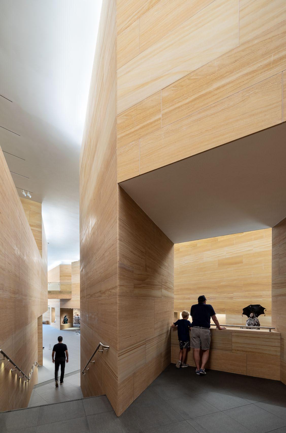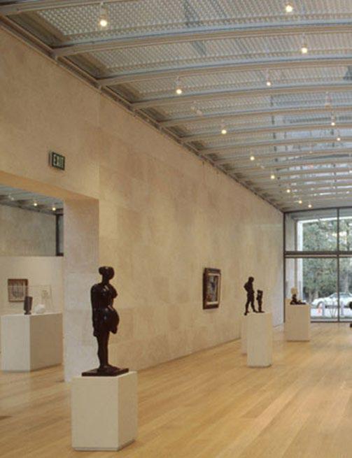 The museum’s main floor is organized into five parallel travertine-clad pavilions, each ending with clear glass walls that extend the interior into the Peter Walker-designed sunken sculpture garden. Its signature curved glass roof features a custom-cast aluminum grill, diffusing light to provide optimal viewing conditions for the art.