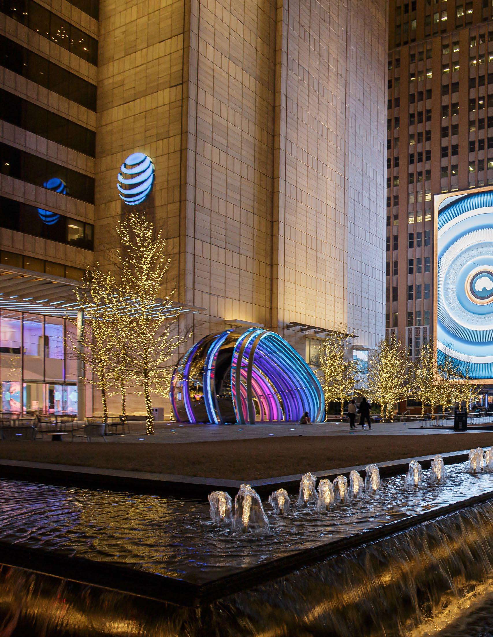 Carpenter Park is located on the eastern edge of Downtown, near Deep Ellum and East Dallas. Since its opening, it is the largest park in the urban core at nearly 6 acres. The park includes spaces for children and dogs to play, a basketball court, an interactive fountain, walking paths, and a pavilion. It also houses two sculptures, including a reimagined version of Robert Irwin’s Portal Park Piece (Slice), the second-most valuable piece of public art owned by the city of Dallas. Other items of the park construction include all new public and private utilities for the new park services; lighting, landscaping, and irrigation (including 10 transplanted trees), hardscape, site fencing, site furnishings, food truck areas, restrooms, and gardens.