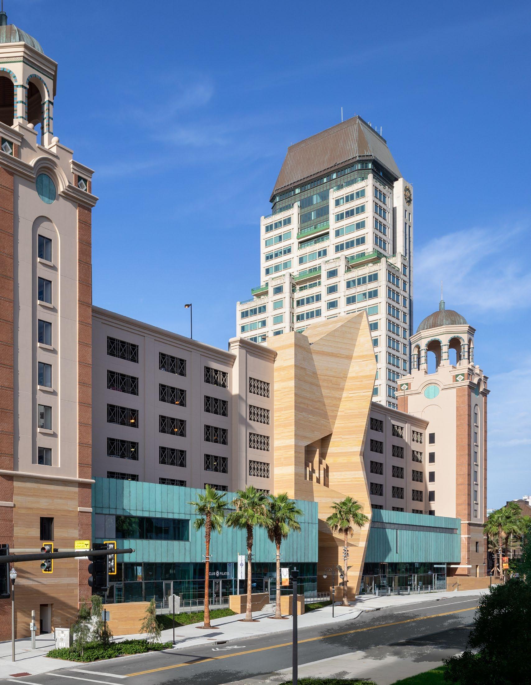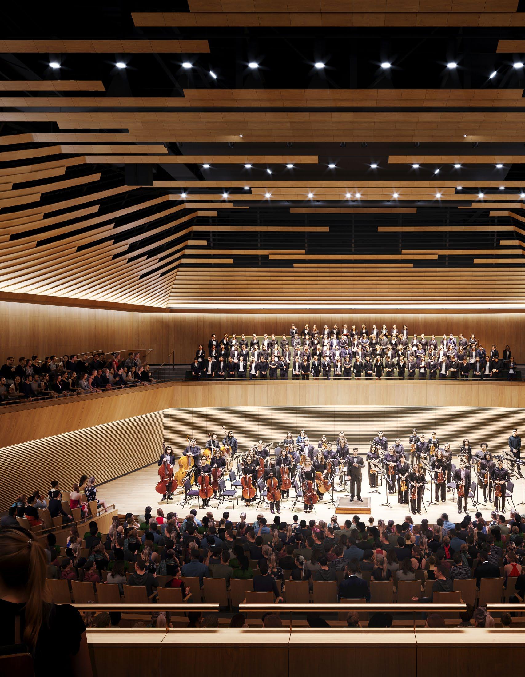 Two-story, 55,600 SF performance hall, 680-seat concert hall, practice rooms, choral and orchestra rehearsal room, 11,300 SF of outdoor program space