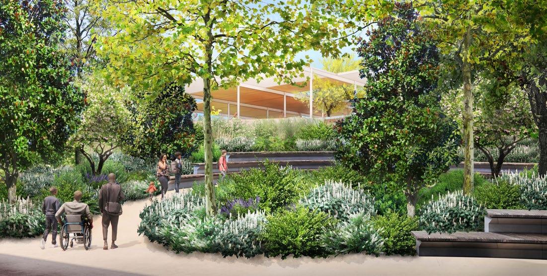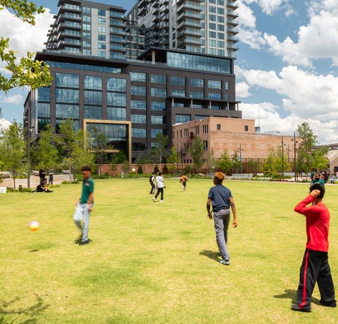 22-acre community urban park, landscaped land bridge, events lodge, park cabana building, play cove deck, state-of-the-art event center, custom play towers, filtration ponds, volleyball courts, skate park, concessions, and dog play areas, 1,500 new trees and 3,000 new plants Program