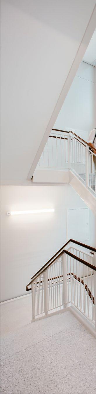 The building features an optimized envelope to balance daylight, glare control, thermal performance, and visibility. Enhanced vertical circulation encourages stair use, while destination dispatch elevators improve efficiency and support social distancing.