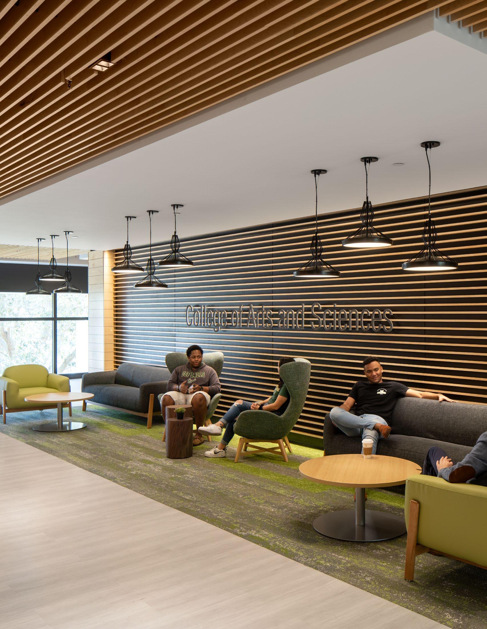 The building provides a centralized space for honors students, faculty, and staff to foster interaction and collaboration. It features seminar and meeting rooms, a large lecture hall, smaller classrooms, a café, a library, student lounges, an amphitheater, and various other spaces to enhance student success. Additionally, it includes essential administrative and faculty offices.